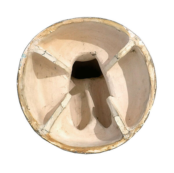 Vollplastischer, gegossener Korpus aus hellem Scherben auf scheibenförmigen Sockel: Darstellung eines knieenden, weiblichen Aktes, der sich die Haare nach hinten streicht, vermutlich die Lorelei darstellend. Höhe ca. 44 cm. Moderate Altersspuren, so zeigen sich kleine Glasurabplatzer und -fehlstellen. Zudem ein Brandriss am Sockel und einer unterseitig. Vereinzelte Goldpunkte am rechten Unterschenkel und am Sockel. Geringes Alterscraquelée. Ungemarkt, wohl Deutschland oder Österreich zwischen 1900 und 1920.