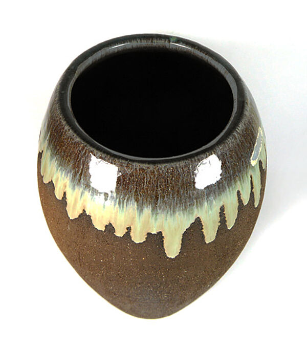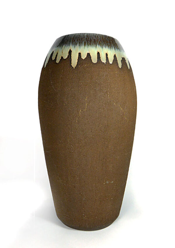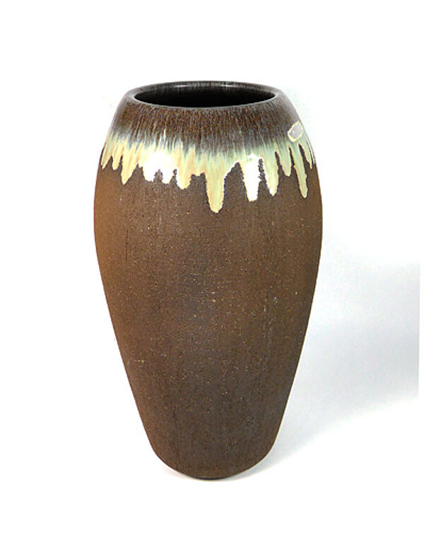 Große, relativ schlanke, im oberen Drittel leicht gebauchte Keramikvase, mattbraun engobiert. Vom Mündungsrand ausgehender, schmaler Saum einer gelb-grünen Laufglasur mit vielen grafisch wirkenden "Nasen". Höhe ca. 30 cm, geringe Alters- und Gebrauchsspuren, kleiner Glasurfehler. Unterseitig gemarkt. Wohl 1960er, 70er Jahre.