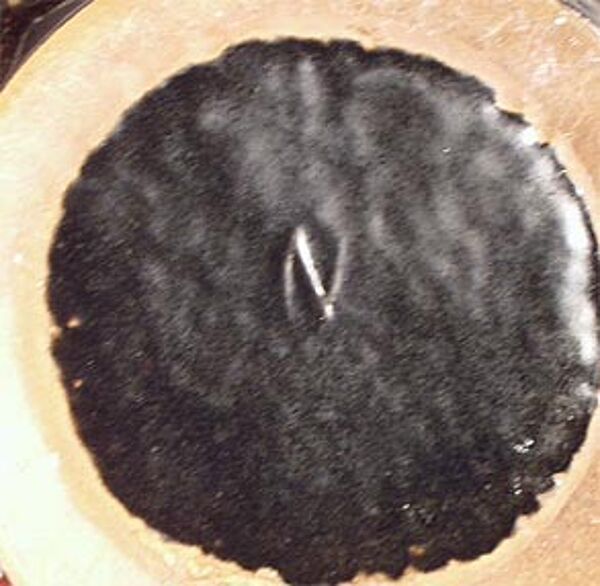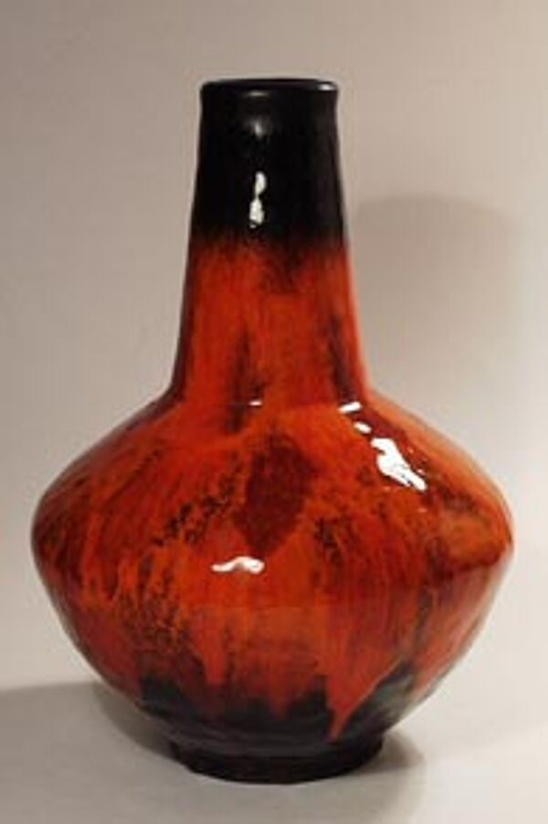 Kurzer gebauchter Korpus mit lang gezogenem Hals, heller Scherben mit leuchtend orange-roter und schwarz-brauner Glasur, Höhe ca. 28 cm, geringe Gebrauchsspuren. Unterseitig Markung "M" oder "Z", wohl Carstens der 60er, 70er Jahre (Atelier-Serie von Gerda Heuckeroth).