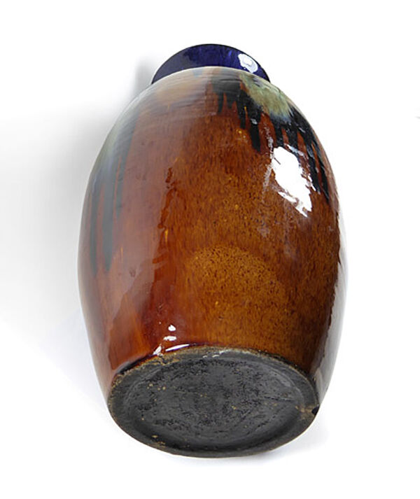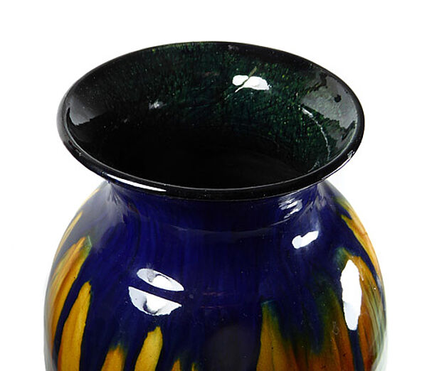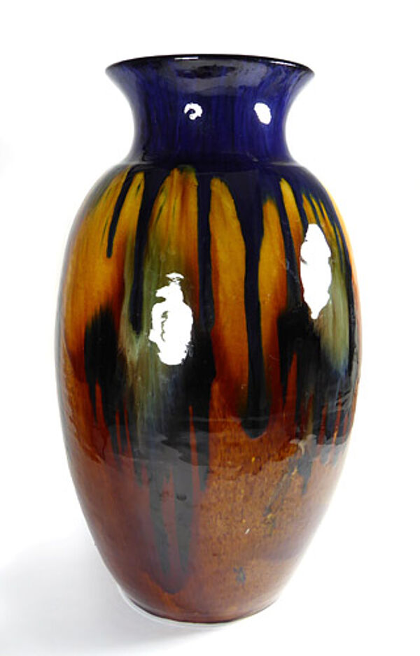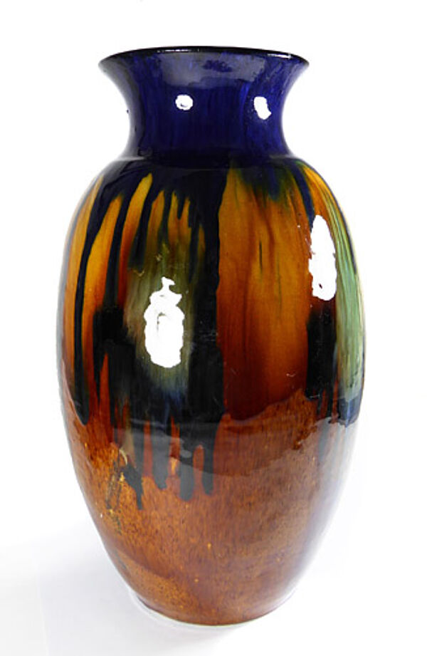 Ovoider Korpus aus hellem Scherben mit kelchartig ausgestelltem Rand. Außenseitig expressive Laufglasur. in Blau-, Ocker- und Grüntönen, Innenseitig monochrom Blaugrün glasiert. Höhe ca. 35,3 cm, es zeigen sich zwei Chips am Mündungsrand und ein Chip am Stand, letzterer vermutlich herstellungsbedingt, da er - wie die gesamte Unterseite - schwarz glasiert ist. Zudem kann man innenseitig im Halsanteil einen nicht durchgängigen, ca. 3,5 cm langen Brandriss ausmachen, sonst zeigen sich geringe Gebrauchsspuren. Ungemarkt, wohl Bürgel um 1905 bis 15.