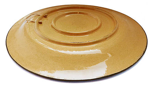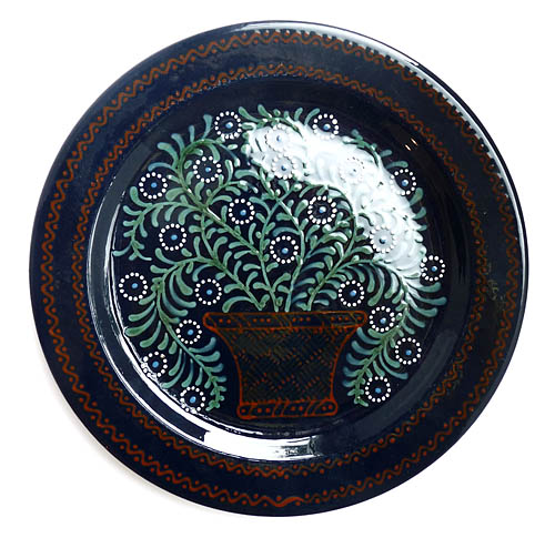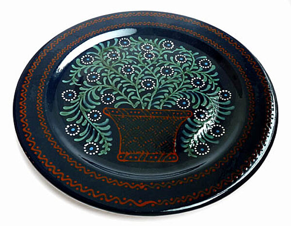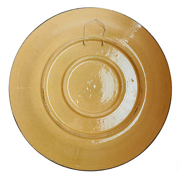 Flach-schalenförmiger Korpus aus relativ hellem Scherben. Rückseitig monochrom gelbe, vorderseitig tief blaue Grundglasur. Hier wurde mit Malhörnchen polychrom das stilisierte Motiv eines aus einem Topf wachsenden Strauches mit weiß-blauen Blüten aufgebracht. Durchmesser ca. 38 cm, geringe Alters- bzw. minimale Kratzspuren, am rückseitigen Randbereich ist ein kleiner, herstellungsbedingter Materialverlust auszumachen. Rückseitig sind am oberen flachen Standring zwei Löcher zur Hängung ausgespart. Zudem hier Markung und von Glasur überdeckte Form-Nummer, wohl um 1910.