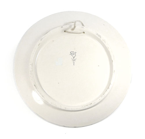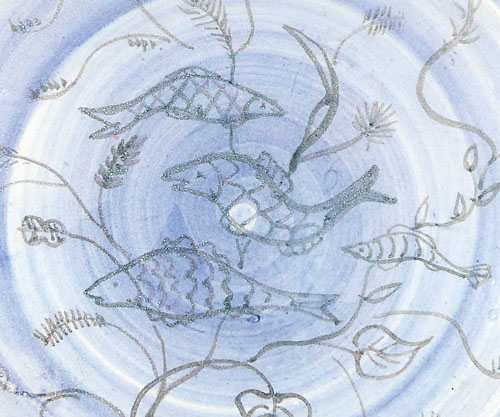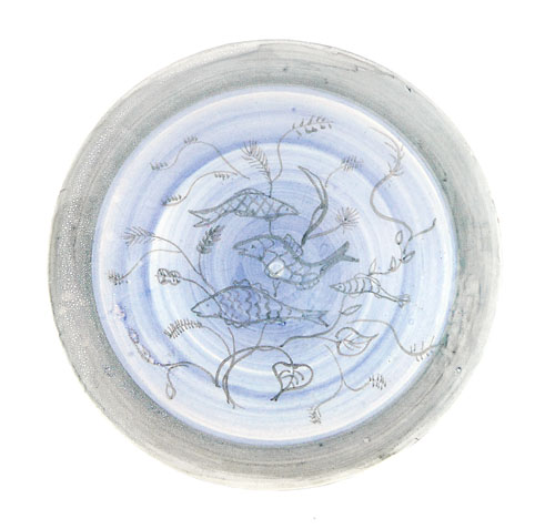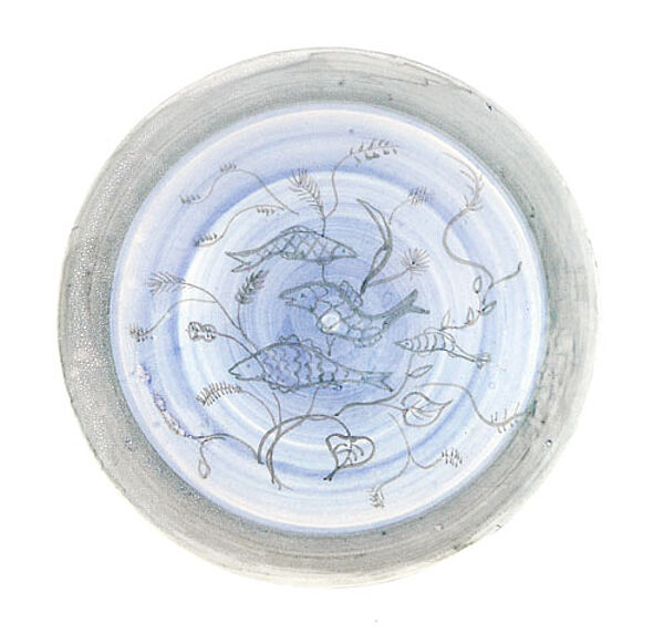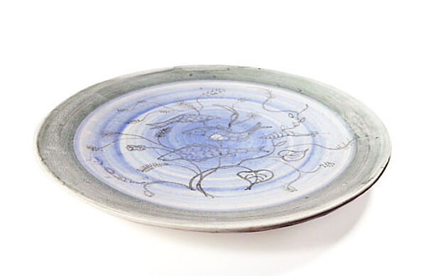 Flacher Tellerkorpus aus hellem Scherben mit handgemaltem Dekor: vor Ringelementen in Hellblau-, Weiß- und Grautönen schwimmen vier stilisierte Fische durch Meerespflanzen. Durchmesser ca. 30 cm, Höhe ca. 3 cm, geringe Alters- und Gebrauchsspuren. Rückseitig Markung und Aufhängelöcher im flachen Standring. Wohl Entwurf und Ausführung von Gerda Frommann Ende der 1920er Jahre.
