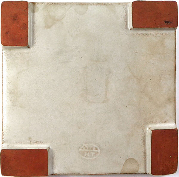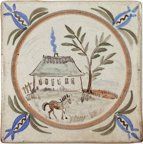 Fliesenartiger, quadratischer Korpus aus rotbraunem Scherben. Unterseitig befinden sich in den Ecken jeweils flache, rechteckige Füße. Oberseitig polychrome, skizzenhafte Darstellung einer Koppel, im Hintergrund ein Haus mit rauchendem Schornstein und ein Baum. Maße ca. 10,3 x 10,3 cm, Höhe ca. 1,1 cm, geringe Gebrauchs- und Altersspuren. Wohl 1920er, 30er Jahre. Unterseitig gemarkt.