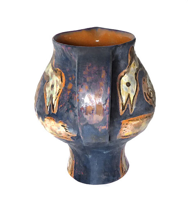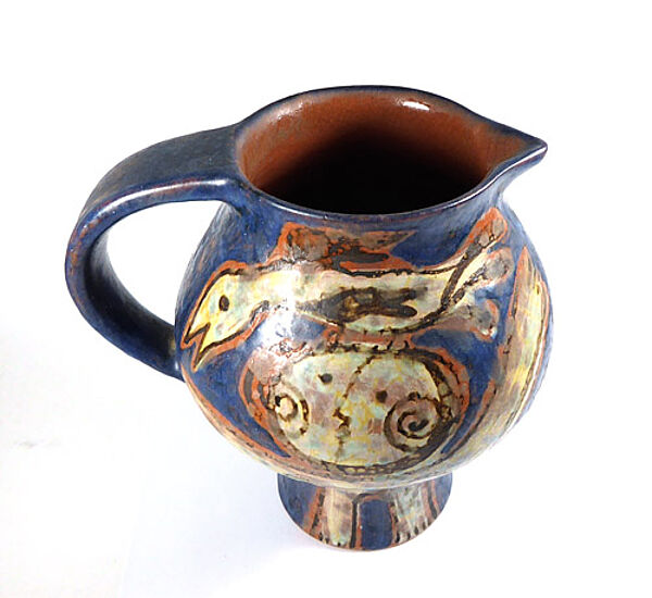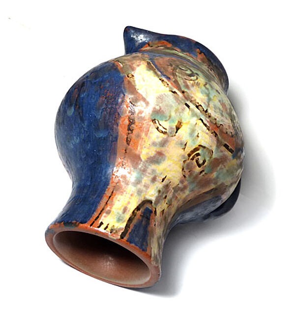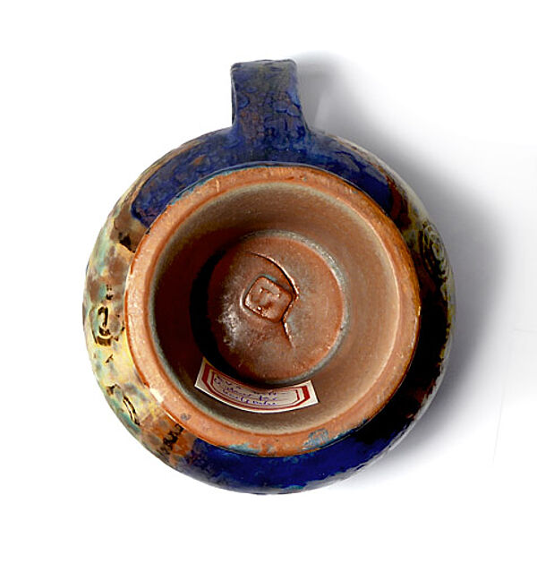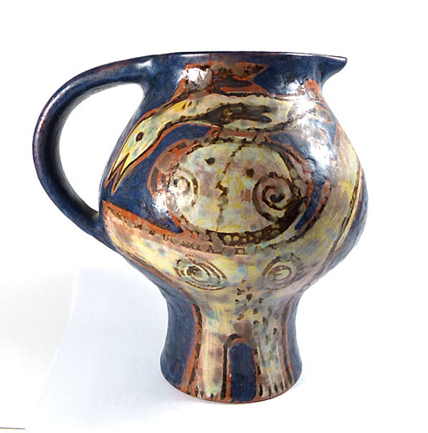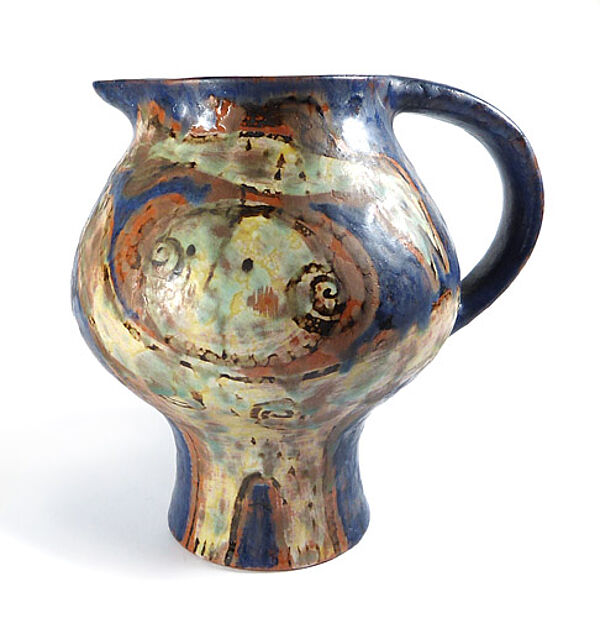 Gebauchter Korpus auf schlankem, gestreckten Fuß, klinkerroter Scherben. Einfache, in den Rand gedrückte Schnaupe, C-förmige Handhabe. Außenseitig handbemaltes, polychromes Dekor eines expressiv-stilisierten, sich umarmenden Liebespaares. Höhe ca. 17 cm, geringe Altersspuren. Unterseitig Markung, wohl 1970er Jahre.