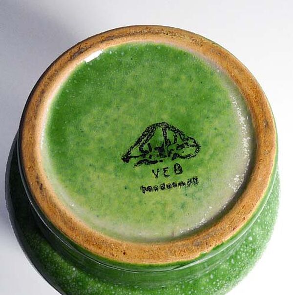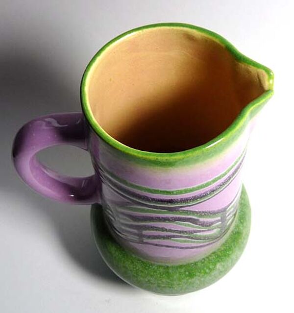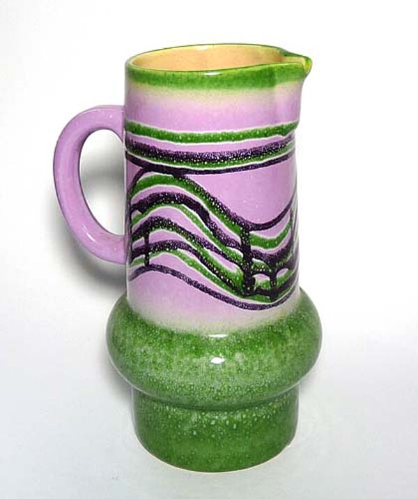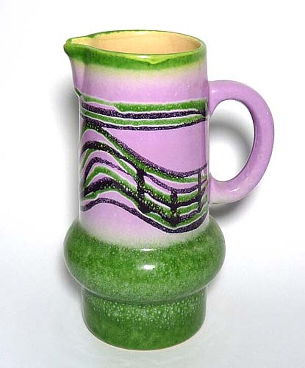 Im unteren Drittel wulstartig gebauchter, ansonsten zylindrischer Korpus mit C-förmiger Handhabe und gering ausgeprägtem Ausguss. Beige-farbener Scherben, innen mit heller, gelblicher, außen im unteren Drittel mit grüner, ansonsten violetter Glasur. Hier abstraktes Liniendekor in Grün und Schwarz. Höhe ca. 20,5 cm, geringe Gebrauchsspuren. Unterseitig gemarkt, wohl 60er, 70er Jahre.