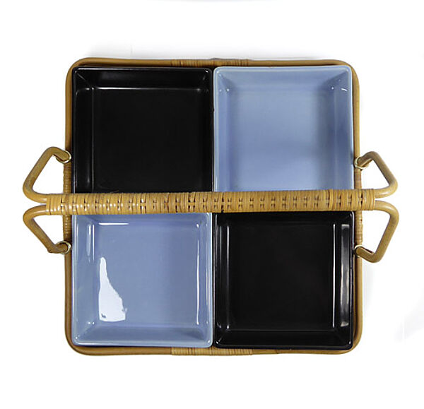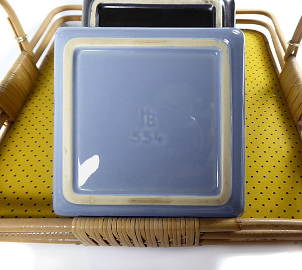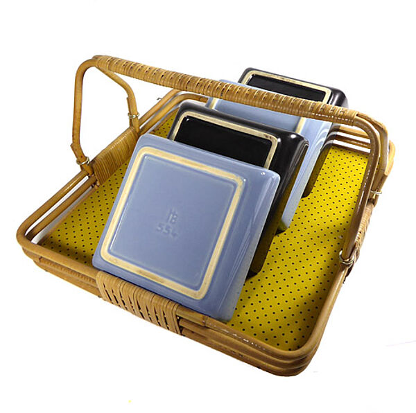 Quadratisches Tablett aus mit Stoff (gelb, schwarze Punkte) bespanntem Sperrholz, Galerie und Handhabe aus Rohr. Hierzu 4 quadratische Keramikschälchen, jeweils 2 monochrom schwarz und 2 monochrom blaugrau glasiert. Maße der Schälchen ca. 12 x 12 x 3,2 cm, Tablettmaße ca. 26 x 26 cm, Höhe ca. 13,5 cm, eine blaugraue Schale weist zwei kleine Chips auf, sonst nur geringe Altersspuren. Die Schalen sind jeweils unterseitig gemarkt. Wohl 1950er Jahre.