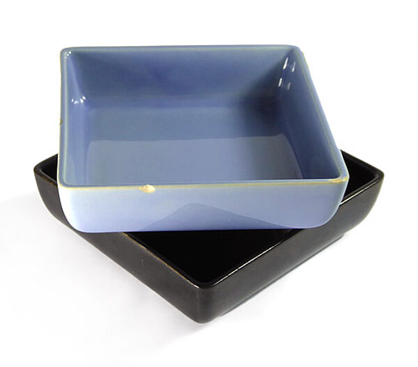 Quadratisches, schwarzes Tablett mit 4 quadratischen Schalen, je 2 mit monochrom heller und je 2 mit monochrom schwarzer Glasur. Maße: Tablett 24,5 cm x 24 cm, Maße Schalen 11,5 x 11,5 cm, unterseitig jeweils gemarkt, Ausführung wohl um 1950.