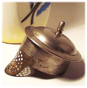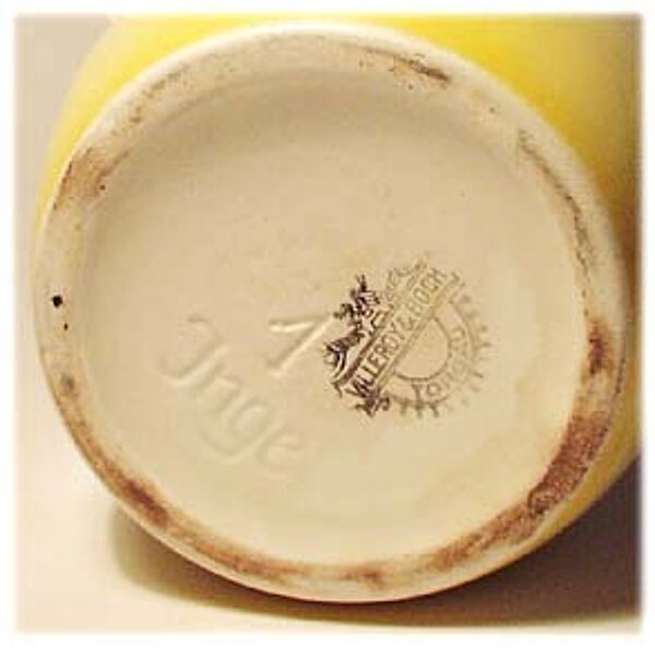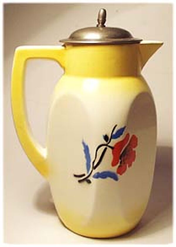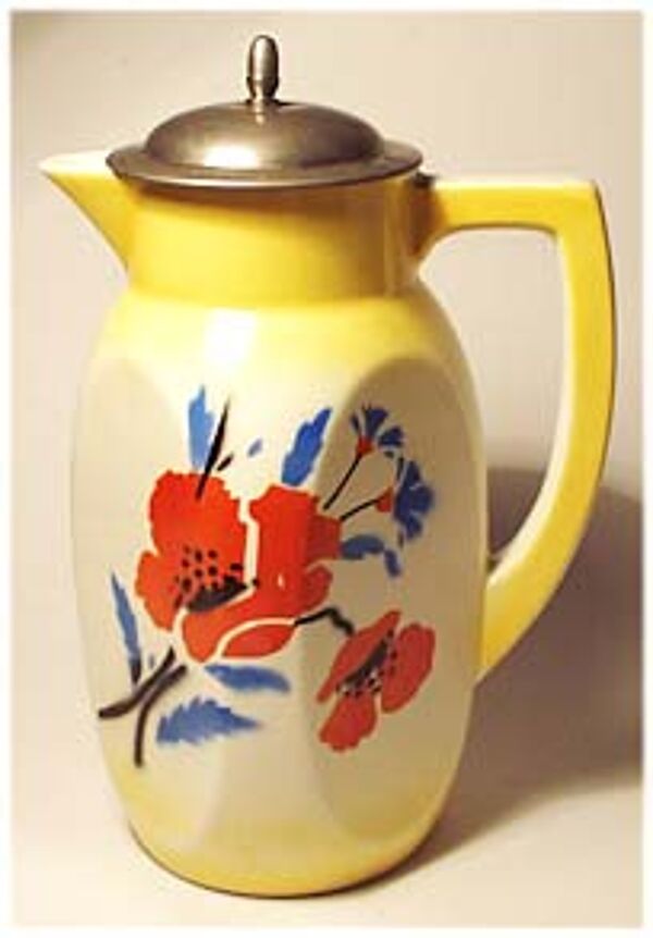 An vier Seiten abgeflachter Korpus, heller Scherben an den Rändern leuchtend gelbe, ansonsten helle, fast weiße Grundglasur. Aufgespritztes, polychromes Mohn- und Kornblütenmotiv mit einer winzigen Glasurbereibung, siehe Foto. Vernickelter Metalldeckel mit Sieb und länglicher Handhabe, hier z.T. deutlichere Bereibungen des Nickels, siehe Foto. Höhe ca. 23 cm. Unterseitig gemarkt sowie geprägt "Inge" und "1", wohl 20er Jahre.