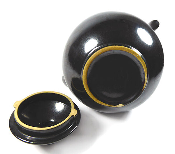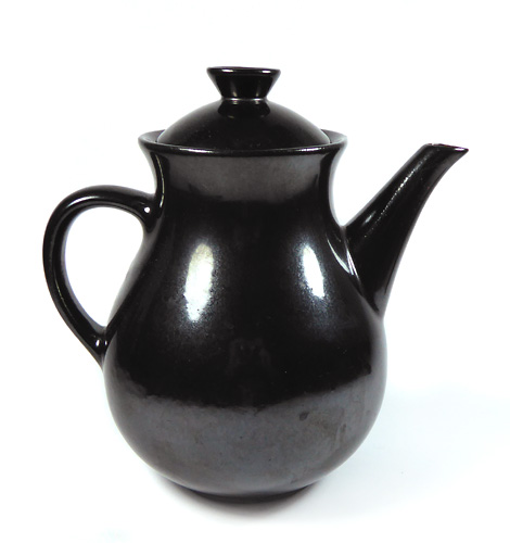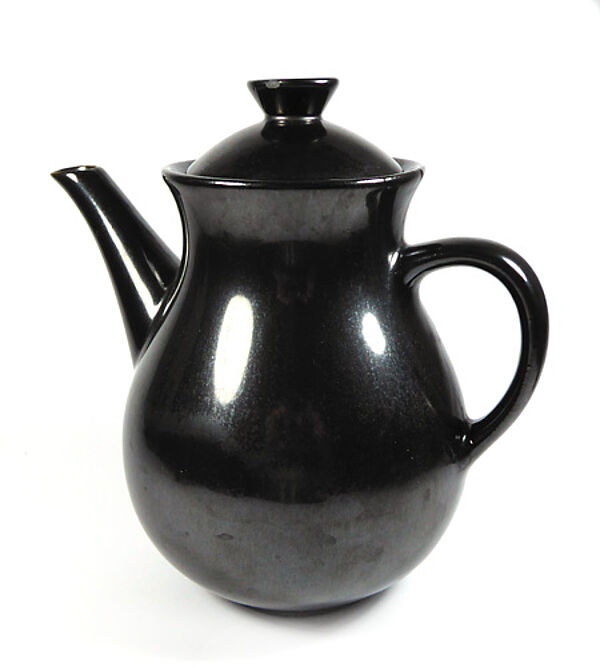 Gebauchter Korpus aus beigem Scherben, monochrom schwarz glasiert. Höhe ca. 17,5 cm, unterseitig kleiner Abschlag am Standring. Unterseitig Markung, wohl 1950er Jahre.