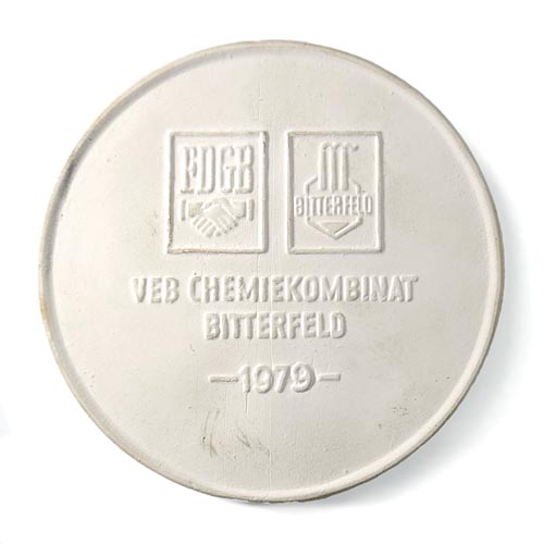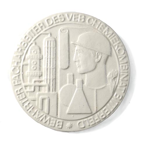 Weißer Porzellankorpus, oberseitig flach reliefierte Darstellung eines Chemiearbeiters mit Helm im Profil nach links, zudem stilisierte Darstellung kleiner und größerer chemischer Gerätschaften. Umlaufend bezeichnet: BEWÄHRTER FACHARBEITER DES CHEMIEKOMBINATES BITTERFELD. Oberseitig glasiert, Rückseite unglasiert, hier sind die Signets des FDGB (Freien Deutscheb Gewerkschaftsbundes) und des VEB Chemiekombinat Bitterfeld zu sehen, zudem der Schriftzug: VEB CHEMIEKOMBINAT BITTERFELD - 1979. Durchmesser ca. 9,5 cm, geringe Alters- und Schmutzspuren.
