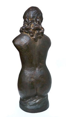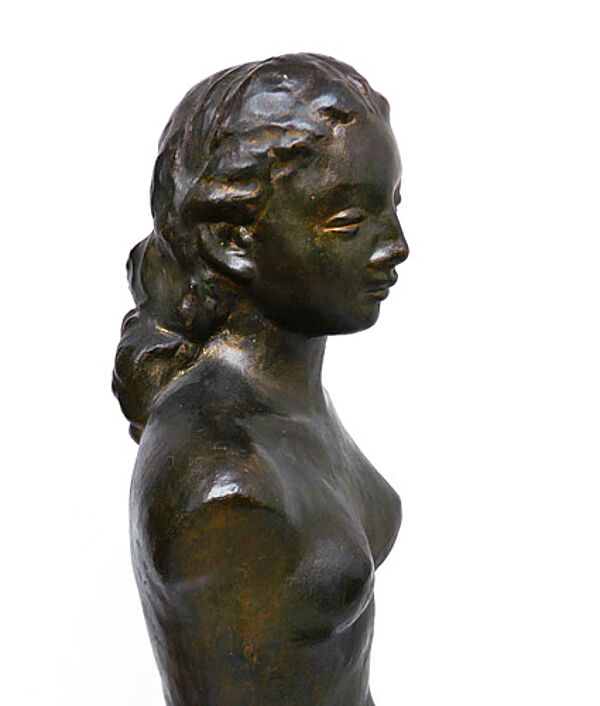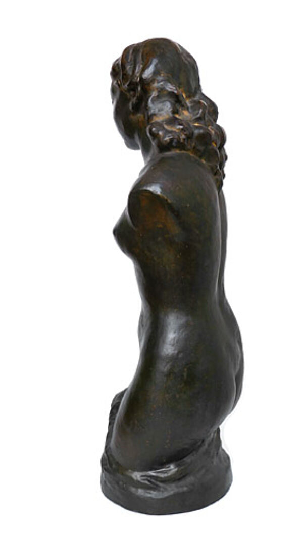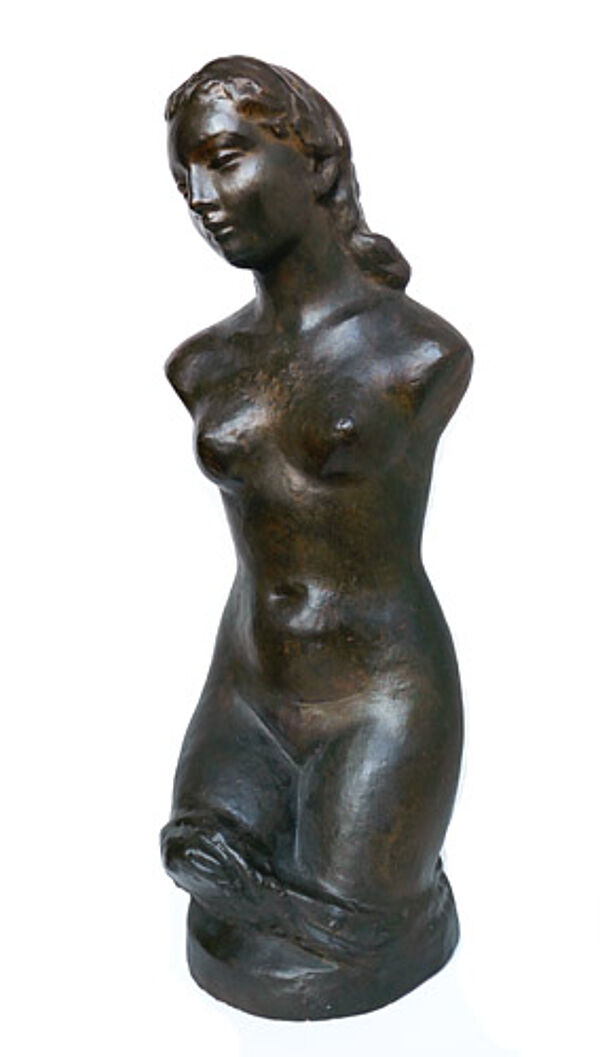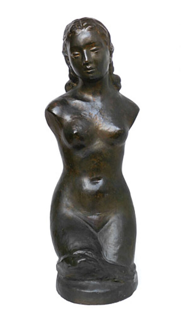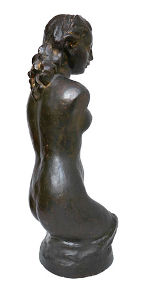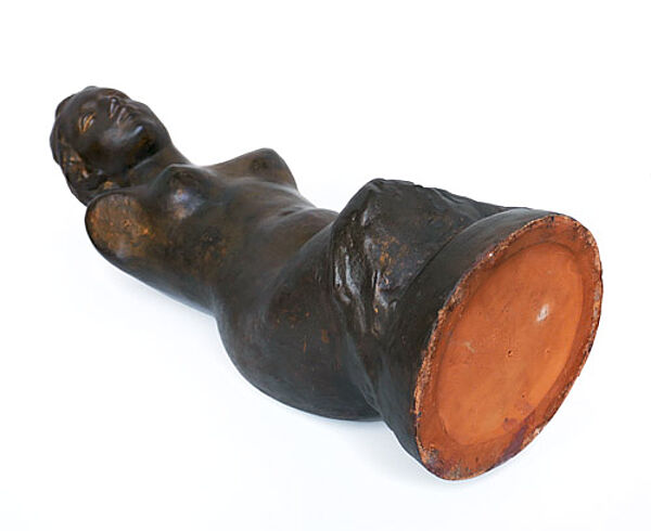 Braun glasierte Korpus aus rötlichem Scherben, im Augen- und Haarbereich partiell Vergoldungen. Höhe ca. 59 cm, geringe Altersspuren. Unbezeichnet, wohl Deutschland der 1920er Jahre (Umfeld Wilhelm Lehmbruck, siehe hier insbesondere seinen "Kleinen weiblichen Torso", den sog. "Hagener Torso", und den Torso der großen Stehenden).
