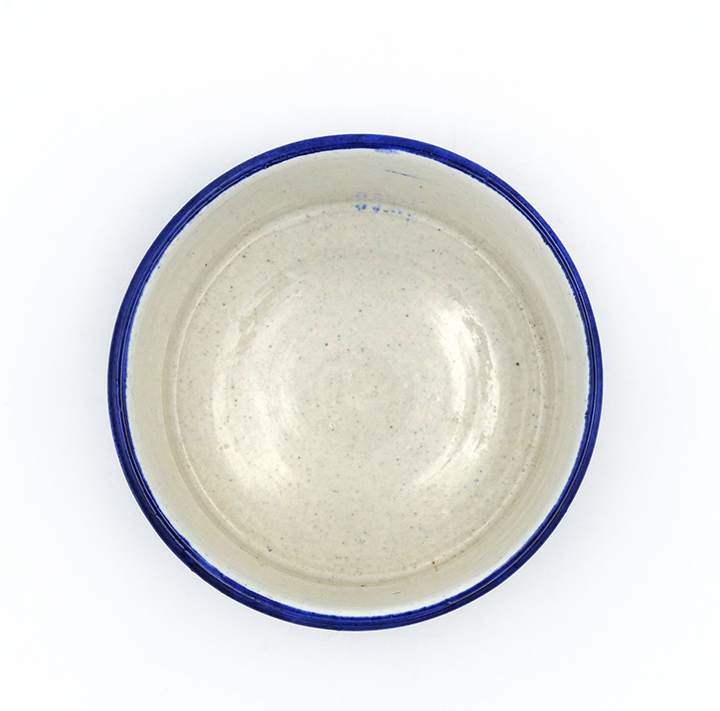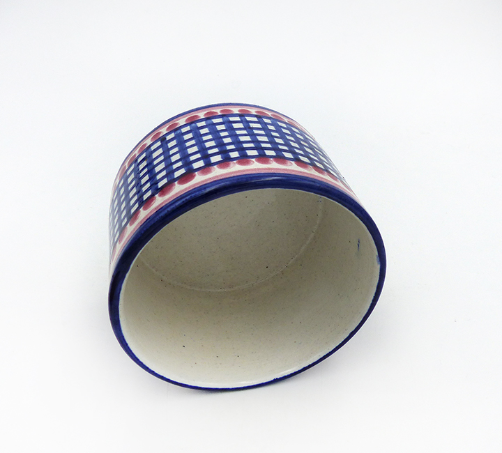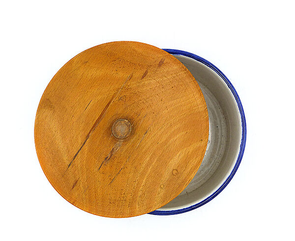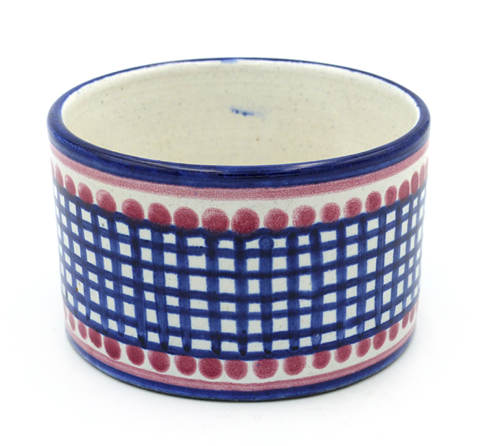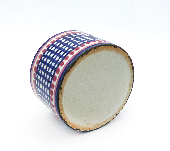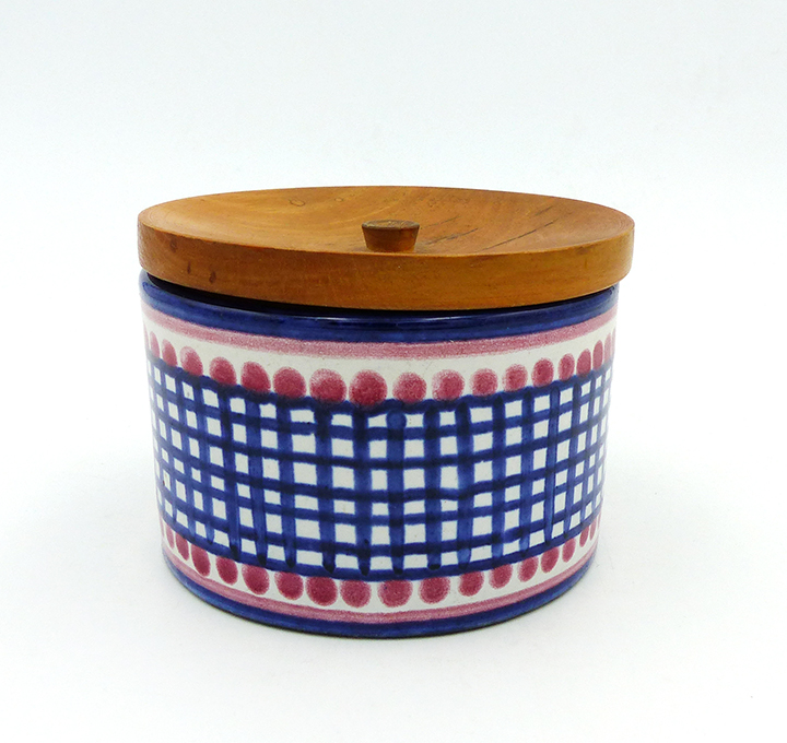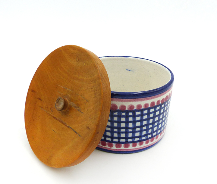 Zylindrischer Korpus aus hellem Scherben, außenseitig Steifen- bzw. Karodekor in Blau, Rot und Beige, innenseitig monochrom beige glasiert. Annähernd scheibenförmiger, unterseitig am Rand einfach gestufter, oberseitig flach konkav gemuldeter Holzdeckel mit mittig kleiner Handhabe. Höhe ca. 7,5 cm (mit Deckel), Durchmesser ca. 10,5 cm, geringe Altersspuren, das Holz ist etwas patiniert. Wohl 1940er, 50er Jahre.