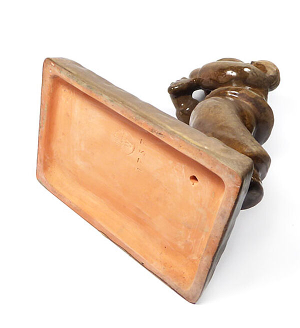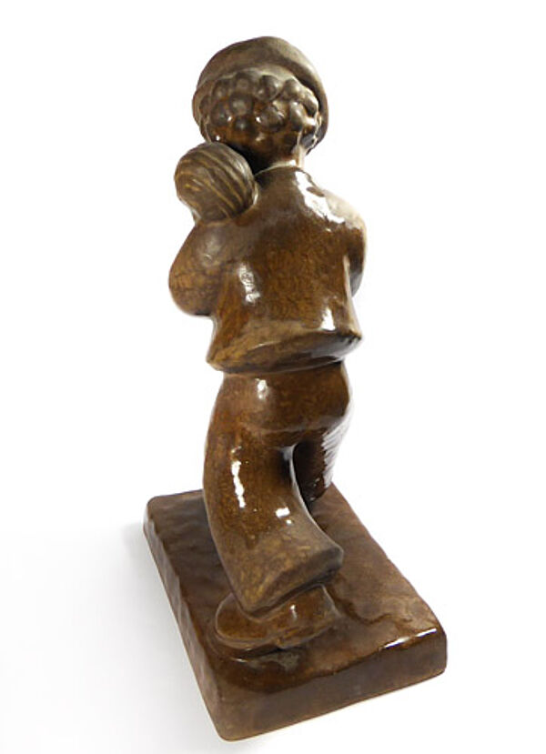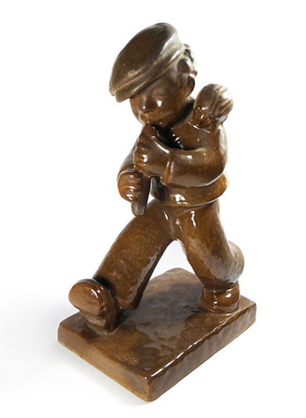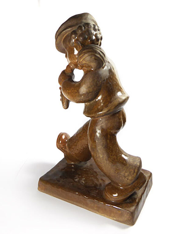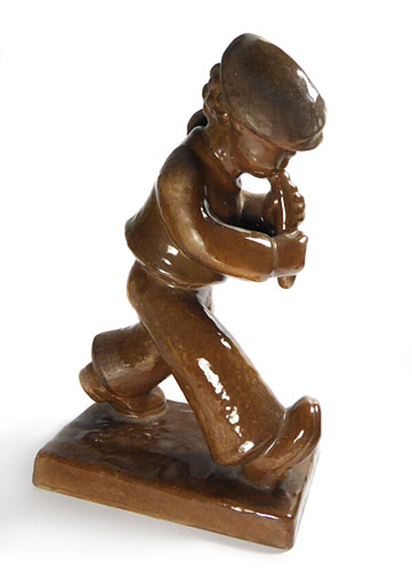 Keramikkorpus aus hellem, rötlich-braunem Scheerben, braune Glasur. Vollplastische Darstellung eines schreitenden, Flöte-spielenden Knabens. Höhe ca. 27 cm, Grundplatte ca.16 x 10 cm, geringe Altersspuren. Unterseitig Markung sowie Form-Nr. "1757", wohl 1920er Jahre. Die Figur dürfte durch die Entwürfe von Berta Hummel beeinflusst worden sein.