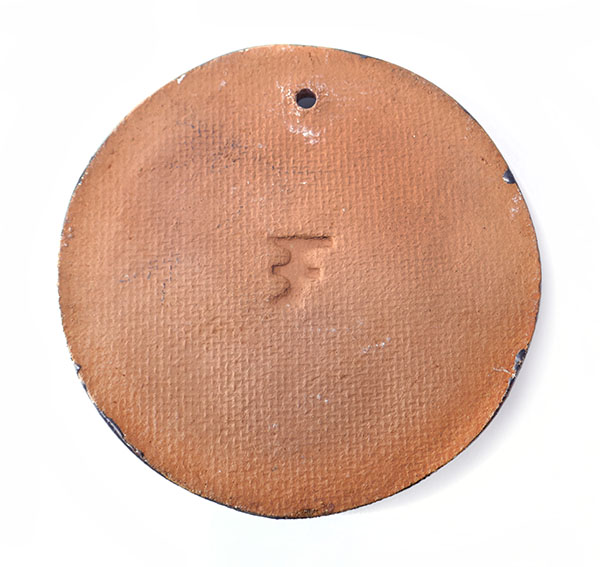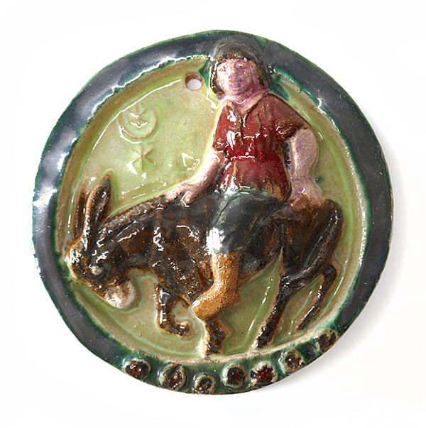 Scheibenartiger Keramik-Korpus aus relativ hellem, rötlich-braunen Scherben. Vorderseitig reliefierte und polychrom glasierte Darstellung des hallischen Müllerburschen, der seinen Esel über Rosen führt. Oberseitig, unterhalb des Randes, durchgehendes Loch zur Aufhängung. Durchmesser ca. 10 cm, minimale Altersspuren. Rückseitig Markung, Entwurf wohl 1960er, 70er Jahre, Ausführung evtl. etwas später.