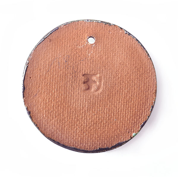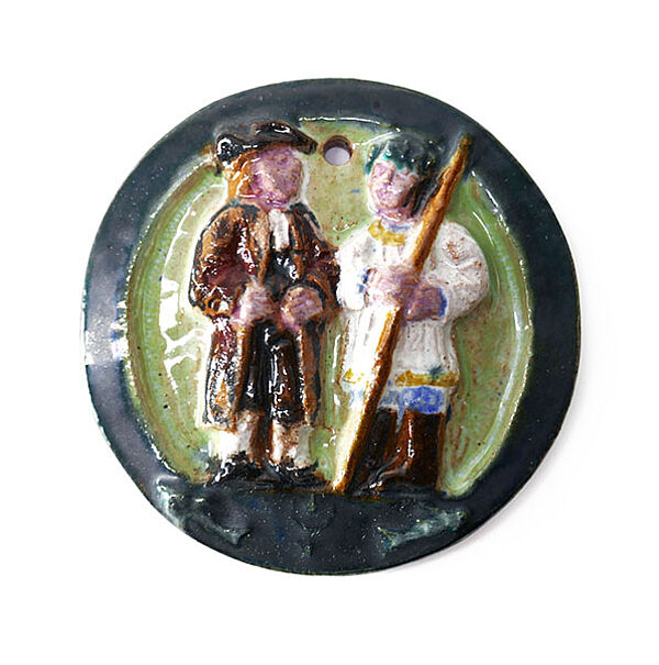 Scheibenartiger Keramik-Korpus aus relativ hellem, rötlich-braunen Scherben. Vorderseitig reliefierte und polychrom glasierte Darstellung eines stehenden Männerpaares, evtl. einen Kaufmann und einen Schäfer darstellend. Am Unterrand flach reliefiertes Stadtwappen von Halle. Oberseitig, unterhalb des Randes, durchgehendes Loch zur Aufhängung. Durchmesser ca. 8 cm, minimale Altersspuren. Rückseitig Markung, Entwurf wohl 1960er, 70er Jahre, Ausführung evtl. etwas später.