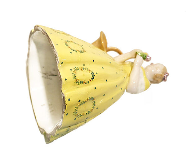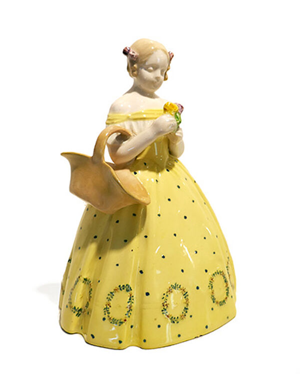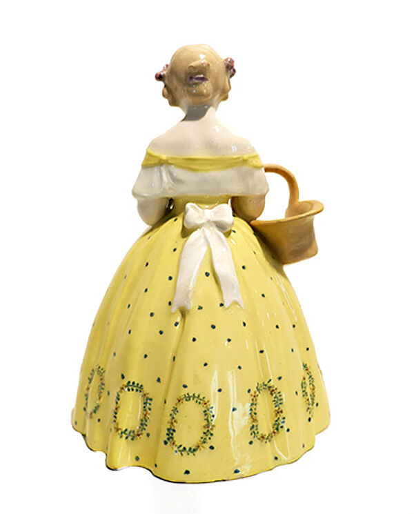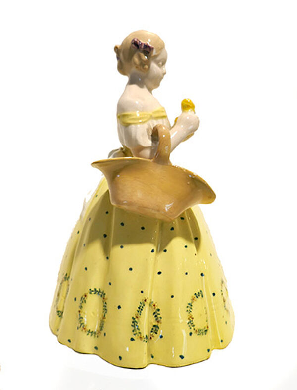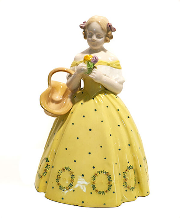 Figürlicher Korpus aus hellem Scherben in Form einer leicht stilisierten jungen Frau im biedermeierlichen Krinolinen-Kleid, am rechten Arm trägt sie einen Henkelkorb, in der Hand hält sie einen kleinen Rosenstrauß. Farbig staffiert. Höhe ca. 18 cm, diskrete Altersspuren, so zeigen sich zwei sehr kleine Chips am innenseitigen Stand. Unterseitig Press- und Stempelmarke sowie Nummerierungen "3913 305 65". Wohl um 1910.