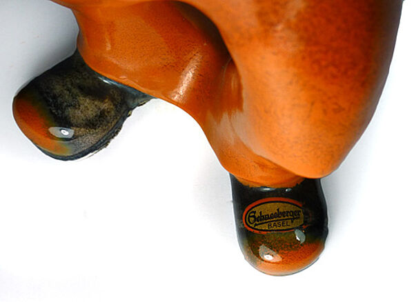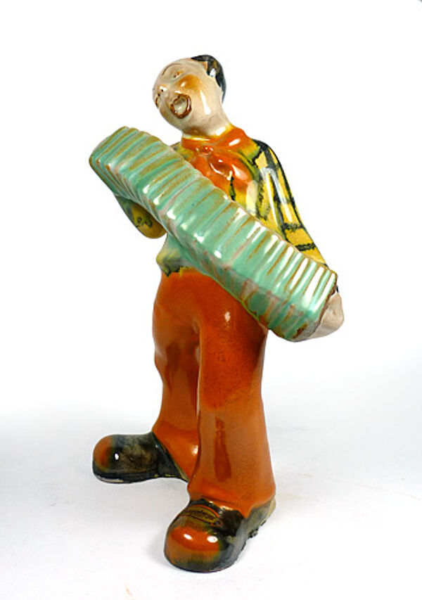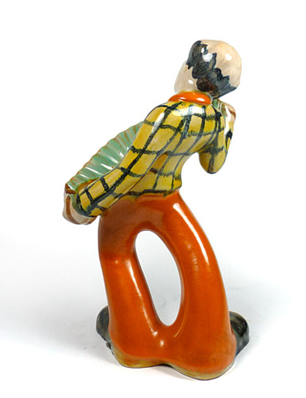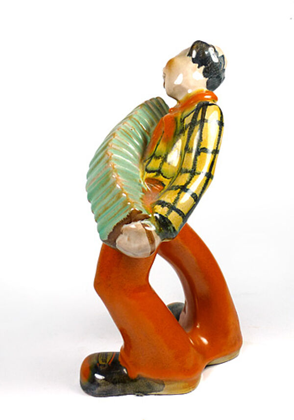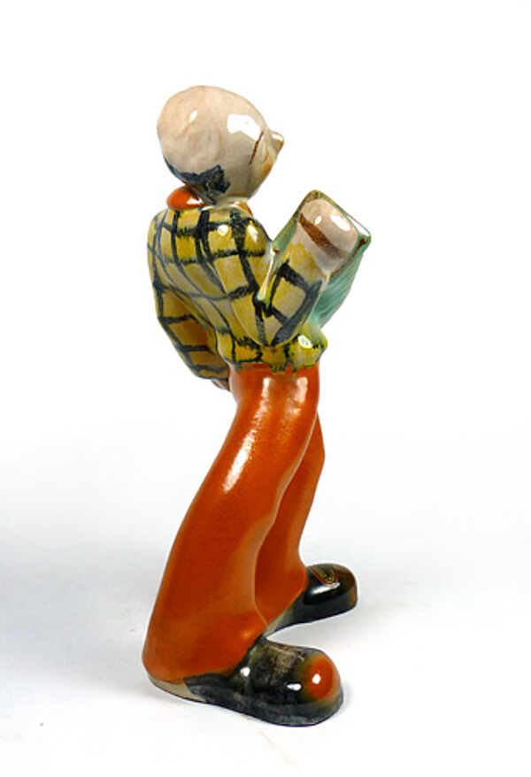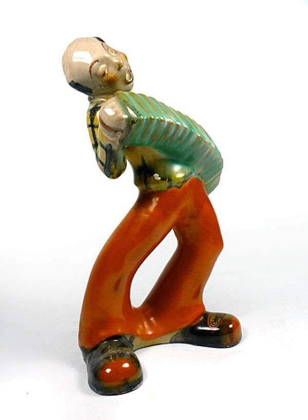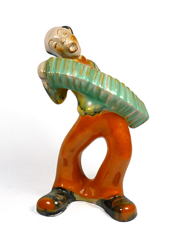 Stilisiert-figürlicher Keramikkorpus aus hellem Scherben, polychrom glasiert, wobei die uranrote Hose dominiert. Höhe ca.19 cm, geringe Altersspuren. Auf dem linken Schuh Etikett des Herstellers oder Händlers: "Schneeberger Basel", wohl 1920er Jahre.