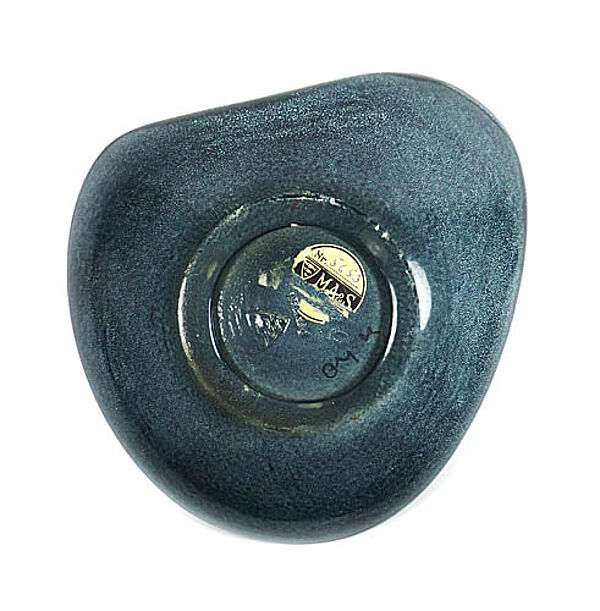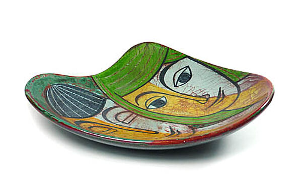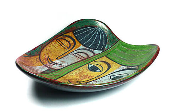 Annähernd dreieckiger, flach schalenförmiger Korpus mit abgerundeten Ecken, einer leicht konkaven bzw. zwei leicht konvexen Seitenkanten und einem unterseitigen, flachen Standring. Oberseitig polychrome, stilisierte Darstellung eines Frauen- und eines Männergesichtes in für Marianne Starck typischem "persischen Craquelée", Maße ca. 20 x 22 cm, Höhe ca. 8 cm, geringe Gebrauchsspuren. Unterseitig Markung und Firmen-Aufkleber. Wohl 1960er Jahre.