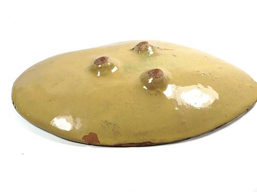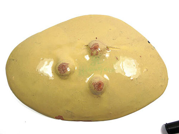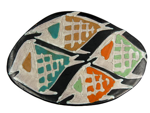 Annähernd ovalärer, etwas asymmetrischer, flach gemuldeter Schalen-Korpus auf drei kleinen Füßen. Unterseitig monochrom hellgelbe Glasur, oberseitig Darstellung von vier polychromen, gleichermaßen stiliserten wie expressiven, dicht beieinander liegenden Fischen auf schwarzem Grund. Maße ca. 25 x 17 cm, Höhe ca. 3 cm, unterseitig am Rand Glasurverlust (siehe Foto), ansonsten geringe Gebrauchsspuren. Unterseitige Markung von Glasur teilweise überdeckt. Wohl Ende 50er, Anfang 60er Jahre.