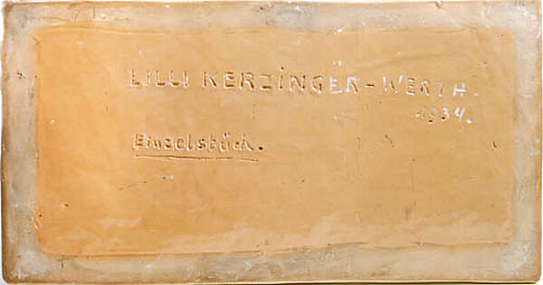 Vollplastischer Korpus aus rötlichem Scherben, hellbeige glasiert. Rechteckige Plinthe. Unterseitig signiert: "Lilli Kerzinger-Werth", datiert "1934" und bezeichnet "Einzelstück". Maße der Sockelplatte ca. 23,5 x 12,5 cm, Höhe ca. 10,5 cm, geringe Altersspuren, diskrete Craquelierung der Glasur. Wohl 1920er bis 40er Jahre.