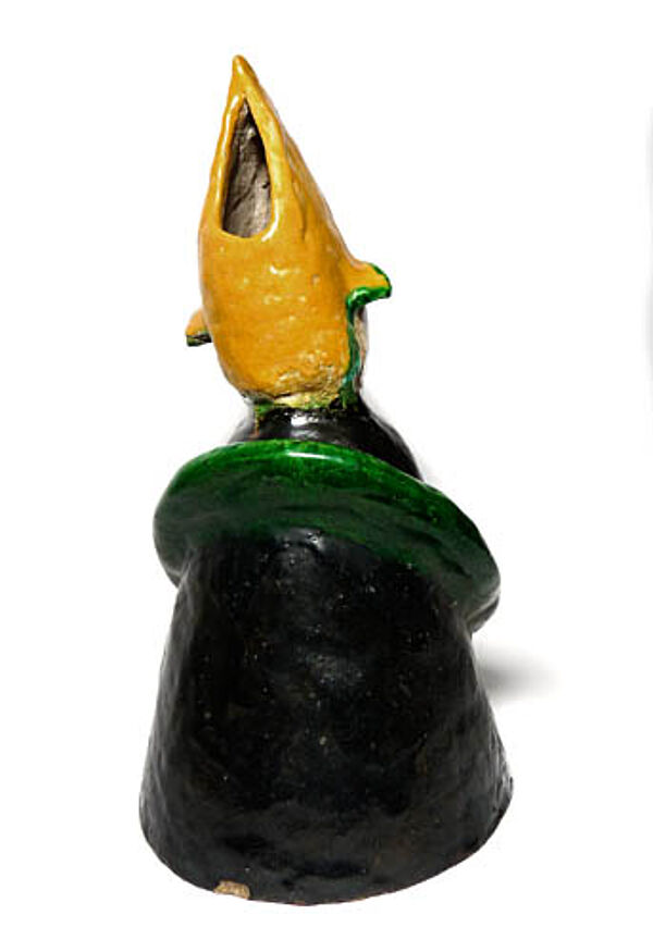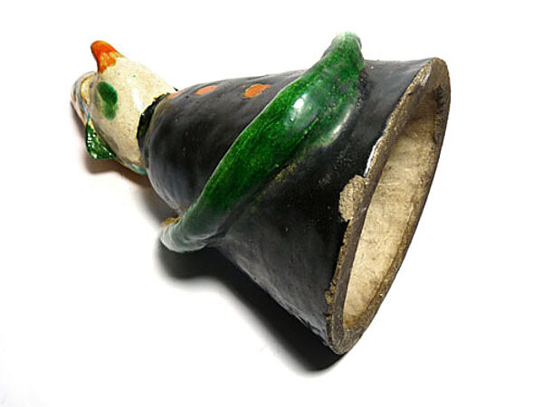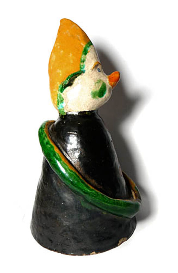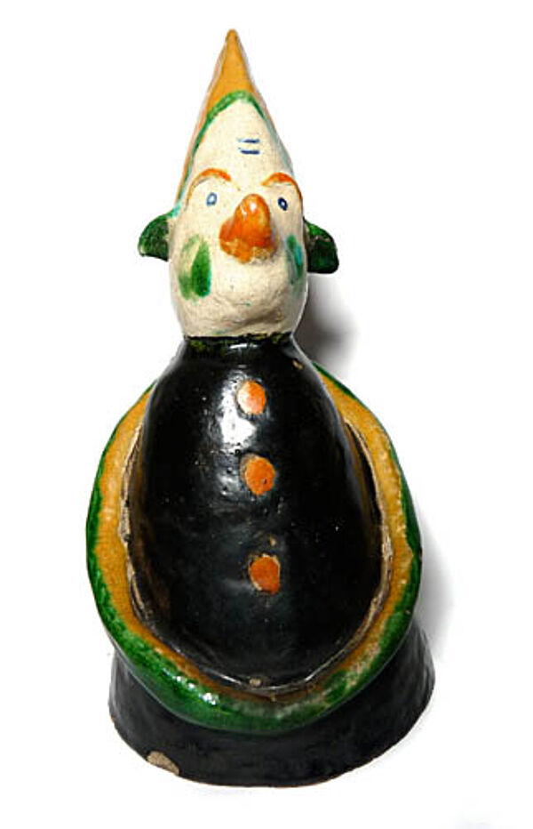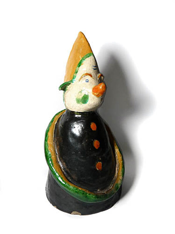 Vollplastischer Keramikkorpus in Form eines stiliserten Clowns. Heller Scherben mit polychromer Glasur, Höhe ca. 35 cm, Standflächendurchmesser ca. 19 cm. Moderate Gebrauchsspuren, insbesondere kann man drei Chips zwischen ca. 0,5 bis 1,5 cm ausmachen. Unbezeichnet, wohl Italien der 50er Jahre.