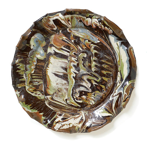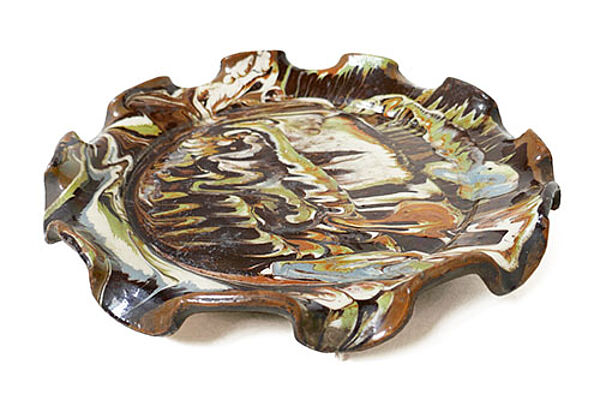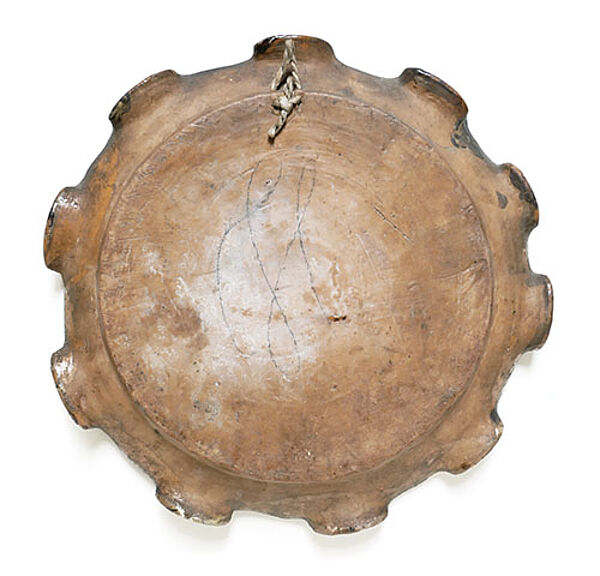 Flach-schalenförmiger Korpus aus hell-rot-braunem Scherben, rhythmisch gewellter Rand. Oberseitig handbemaltes, expressiv-abstraktes, polychromes Dekor. Durchmesser ca. 28 cm, geringe bis moderate Altersspuren. Am rückseitigen Oberrand starre Aufhänge-Öse. Ungemarkt, evtl. Bulgarien der 1920er bis 50er Jahre.