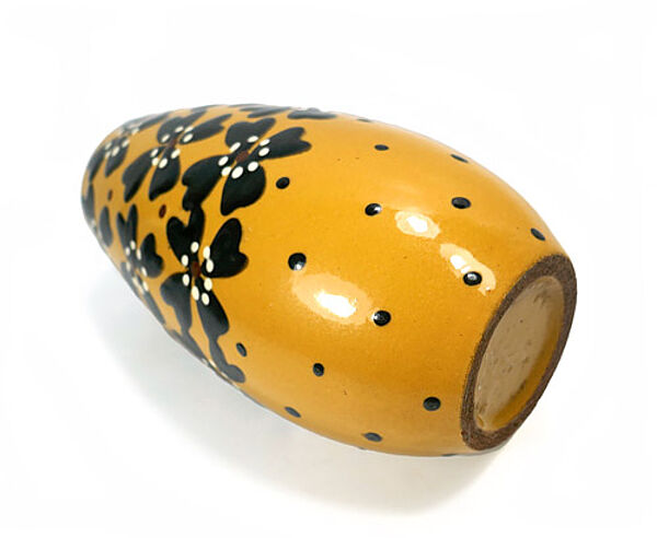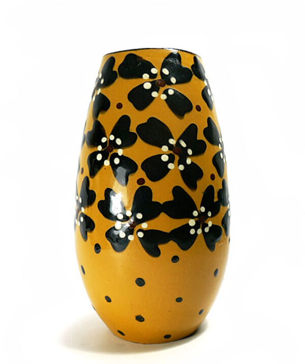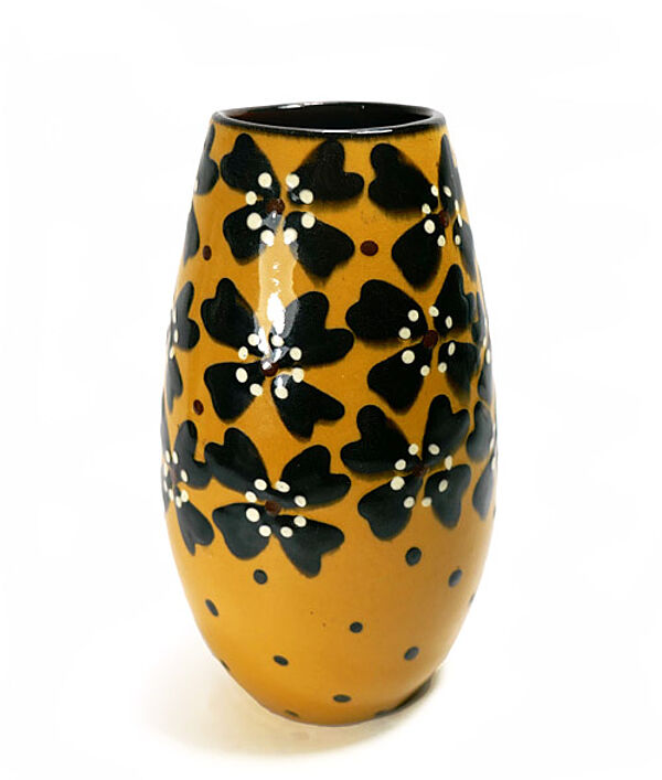 Flach gebauchter Korpus aus ziegelrotem Scherben. Auf bernsteinfarbener Engobe handgemalte Schlickermalerei in Form von stilisierten, vierblättrigen Kleeblättern und Punkten in dunkelbraun, rotbraun und elfenbeinfarben, Mündung mit dunkelbraunem Rand, darüber farblose, craquelierte Bleiglasur. Höhe ca. 17,5 cm, geringe Gebrauchsspuren (minimalst randbestoßen). Entwurf von 1915.