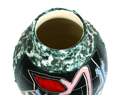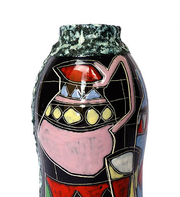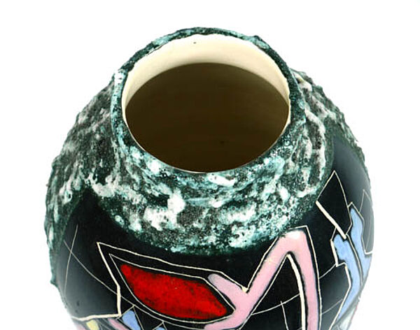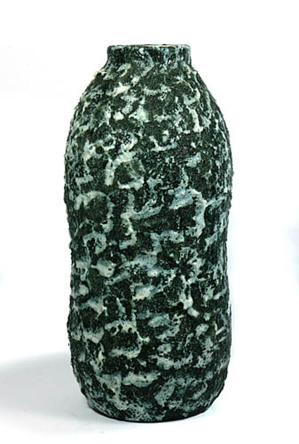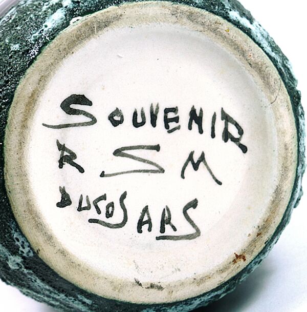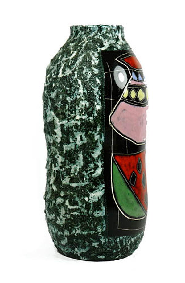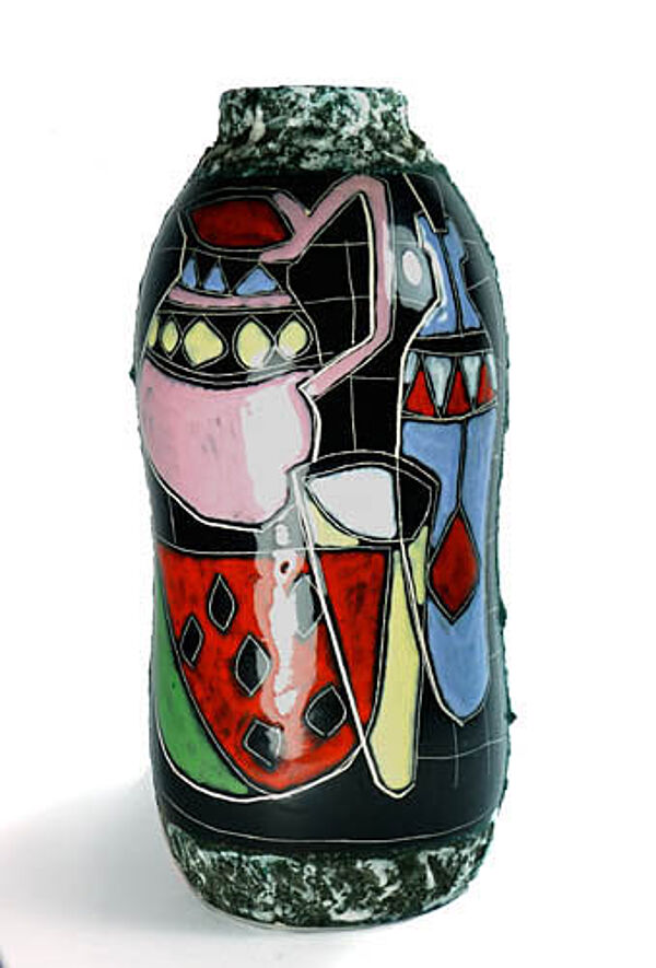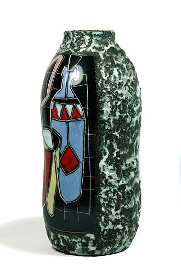 Angedeutet kalebassenartiger Keramikkorpus aus hellem Scherben, schauseitig polychrom glasiertes Stillleben bizarr-stilisierter Gefäße, ansonsten dunkel-hellgrüne "Lava"glasur. Höhe ca. 19 cm, geringe Gebrauchsspuren. Unterseitig ungedeutete Markung "RSM" sowie Bezeichnungen "SOUVENIR" und "DUCOS ARS". Wohl Italien der 1950er Jahre.