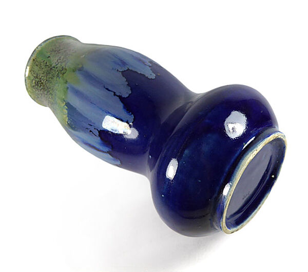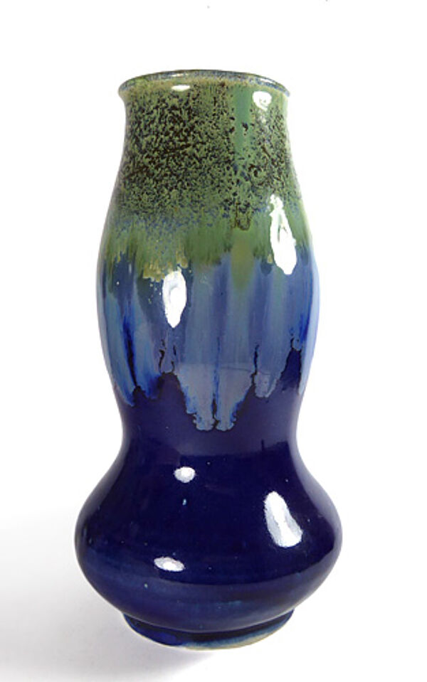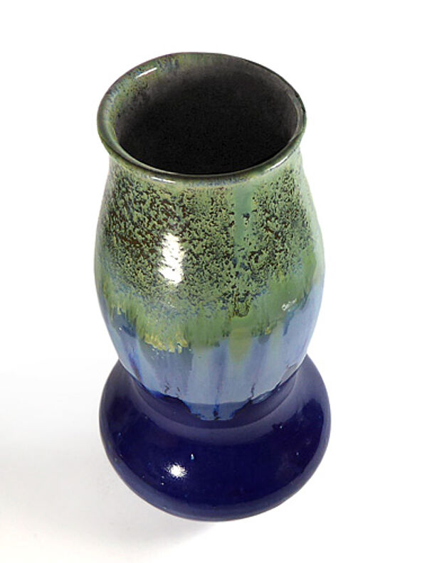 Keramikkorpus aus hellem Scherben. Gebauchter, zweifach taillierter Korpus mit tief-blauer Grund- und im oberen Anteil expressiver Laufglasur in Grün und Hellblau. Höhe ca. 27 cm, geringe Gebrauchsspuren. Ungemarkt, wohl Bürgel (Carl Gebauer?) um 1900 bis 1910.