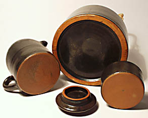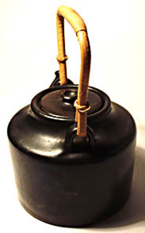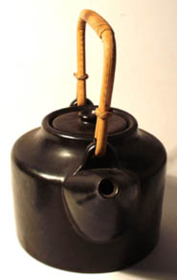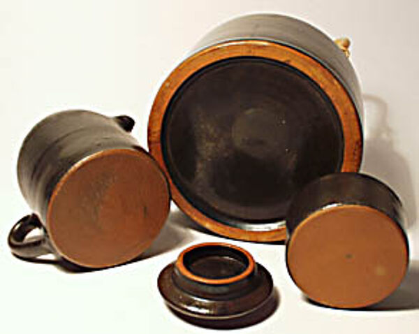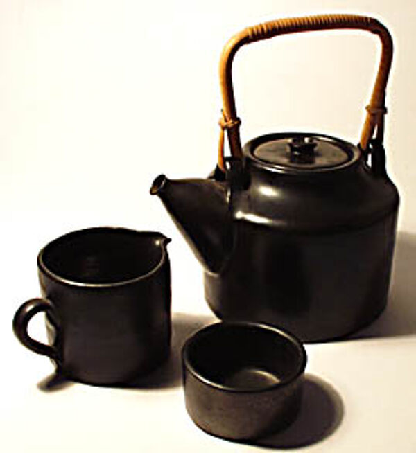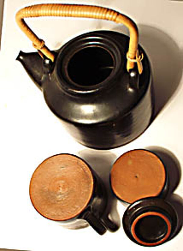 Kernstück mit relativ strenger Formgebung. Hellbrauner Scherben mit monochrom schwarzer Glasur. Höhe der Teekanne mit Henkel ca. 17 cm, Höhe des Sahnekännchen ca. 6 cm, Höhe des Zuckerschälchen ca. 3 cm. Ungemarkt, wohl Deutschland der 30er bis 50er Jahre.