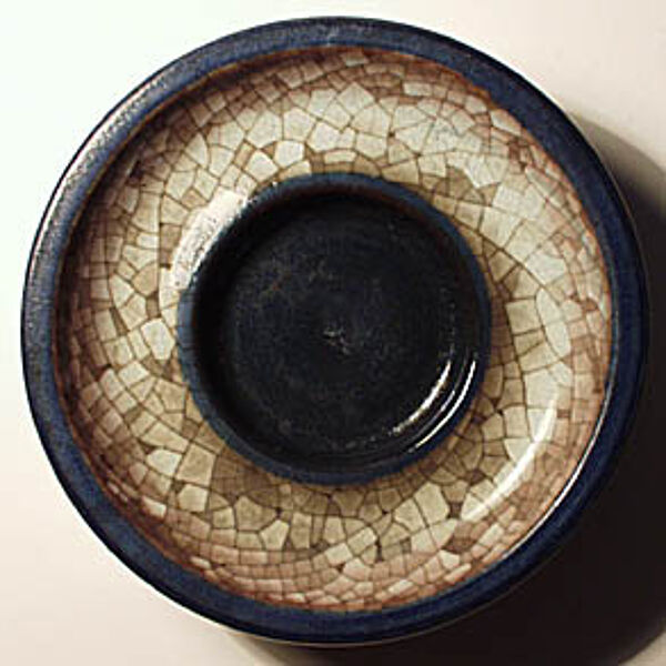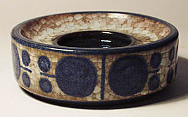 Scheibenförmiger Korpus mit einem Durchmesser von ca. 11,5 cm und einer Höhe von ca. 4 cm. Heller Scherben mit zeittypischem "organisch"-geometrischen Dekor in Beige, Braun und Blau in für Marianne Starck typischem "persischen Craquelée". Unterseitig Markung und Firmen-Aufkleber. Wohl um 1970.