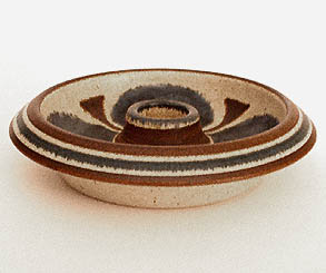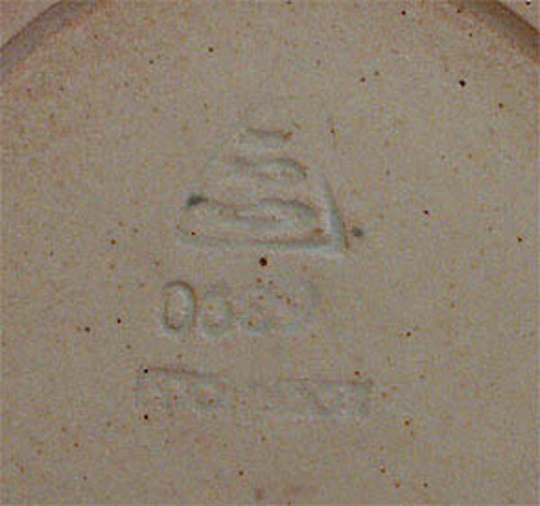 Schalenförmiger Korpus aus Steinzeug-ähnlichem, hellbeigen Scherben. Eierschalen-farbene Mattglasur mit blaugrüner u. brauner Bemalung, D.: ca. 14,5 cm, unterseitig gemarkt mit Fischstempel eingedrückt (=Marke nach 1950, wohl 60er/70er Jahre.