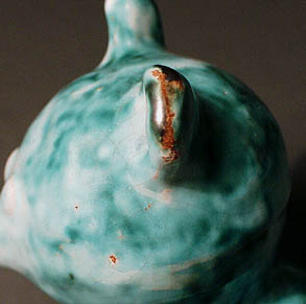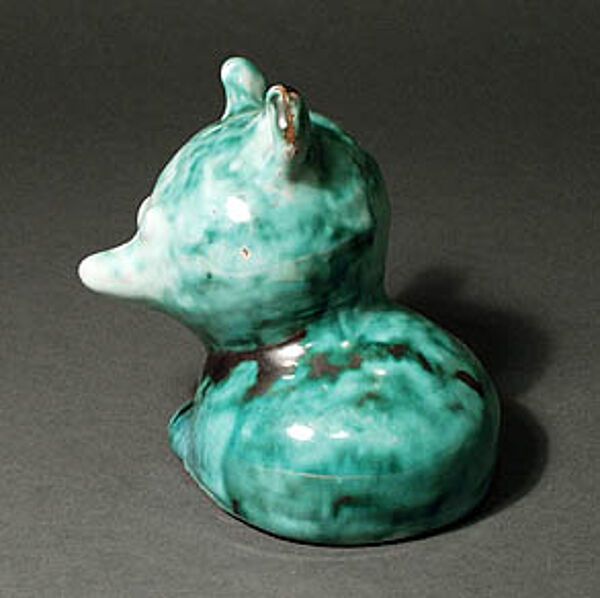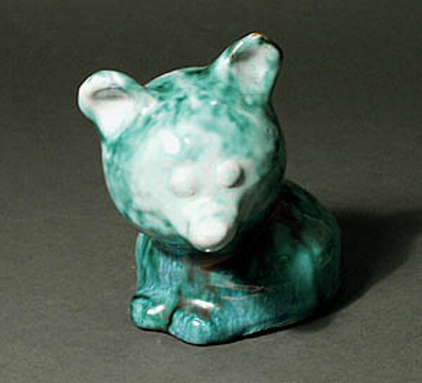 Korpus aus rotbraunem Scherben in Form eines (jungen) Bären. Glasur in verschiedenen Türkis-Tönen. Höhe ca. 10 cm; herstellungsbedingt partiell nicht deckende Glasur, z.B. am Ohr (s. Foto), geringe Gebrauchsspuren. Ungemarkt, Entwurf zumindest unter dem Einfluss von Walter Bosse, wohl 60er Jahre.