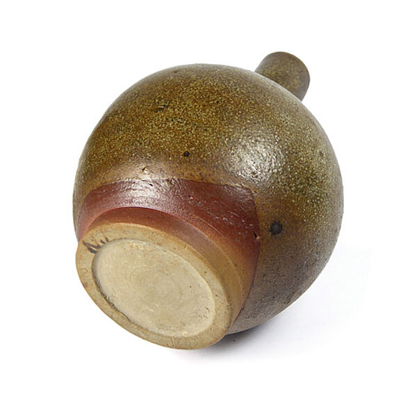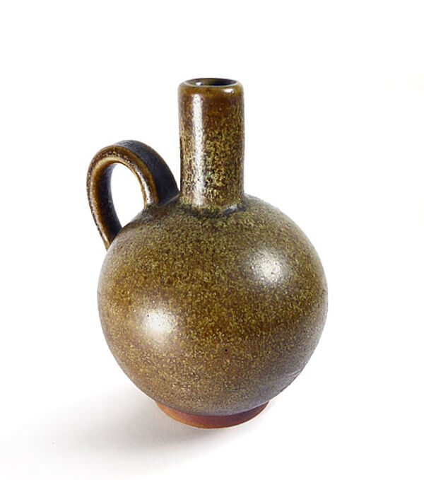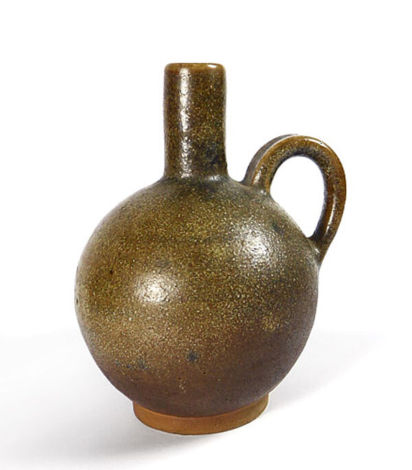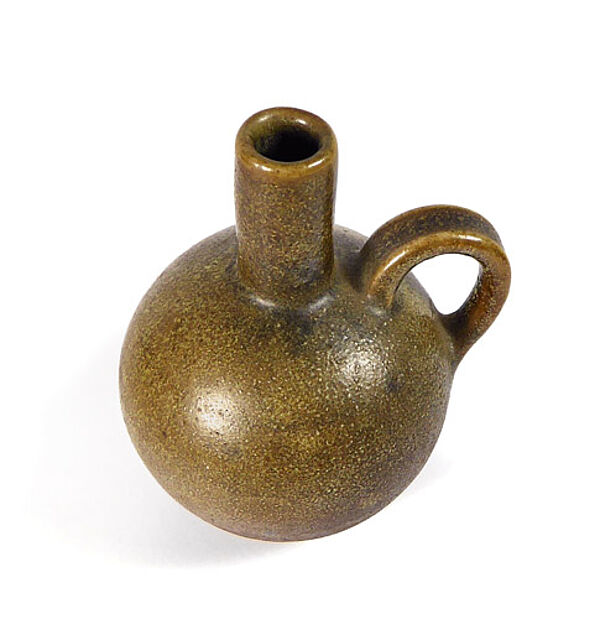 Gefußter Keramikkorpus aus hellem Scherben. Kugelförmig gebauchter Korpus mit zylindrischem, langgezogenen Hals und C-förmiger Handhabe. Braun-beige gesprenkelte Glasur auf rotbrauner Engobe. Höhe ca. 12 cm, geringe Gebrauchsspuren. Ungemarkt, wohl 1930er, 40er Jahre. Nach Aussage des Vorbesitzers sei dies eine Vase, die die Mitarbeiter der Keramikwerkstatt der Burg in der Weihnachtszeit für ihre Angehörigen hergestellt hätten.