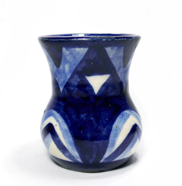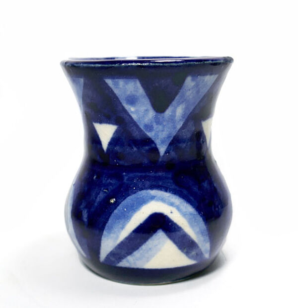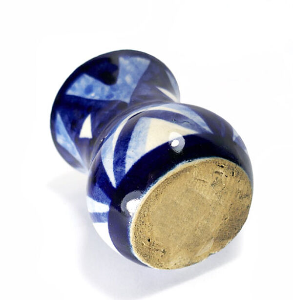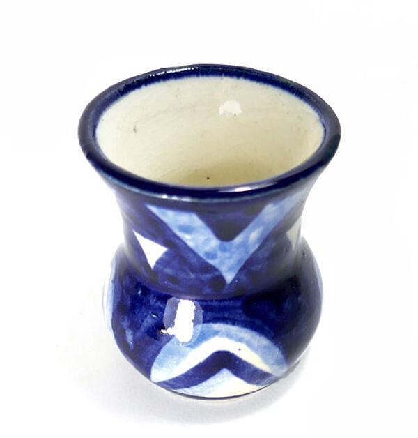 Im unteren Drittel gebauchter, mittig leicht taillierter, zum Rand hin sich leicht erweiternder Korpus aus hellem Scherben. Außenseitig handbemaltes abstrakt-kubistisches Dekor in Blautönen. Höhe ca. 6,2 cm, geringe Altersspuren. Ungemarkt, wohl Bunzlau der 1920er Jahre.