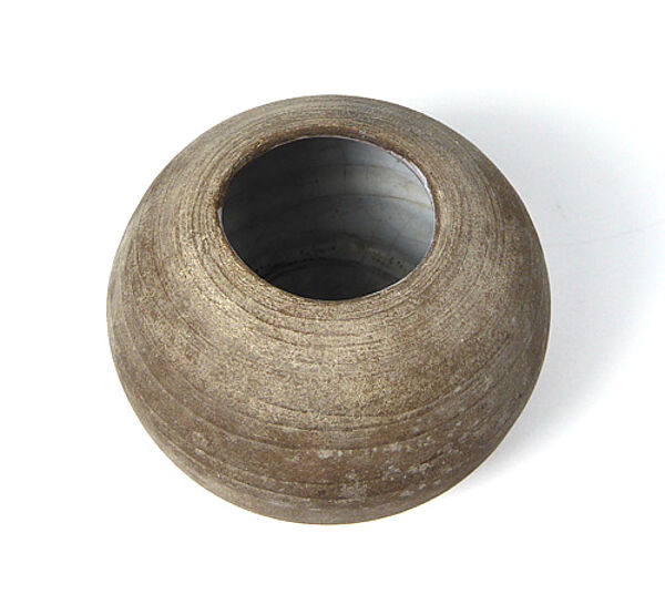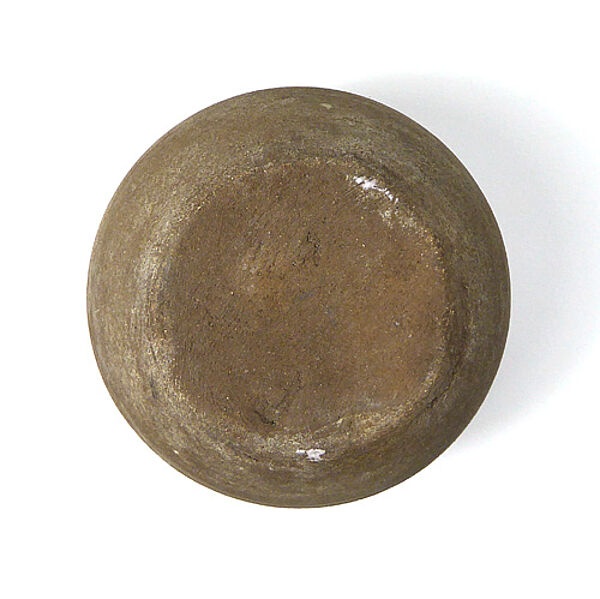Annähernd runder Korpus aus bäunlichem Scherben. Außen in Brauntönen engobiert, innen weiß glasiert. Höhe ca. 6,5 cm, geringe Gebrauchsspuren. Unbezeichnet, wohl Deutschland oder Holland der 1930er bis 50er Jahre.