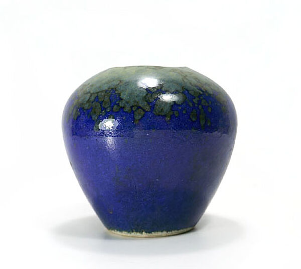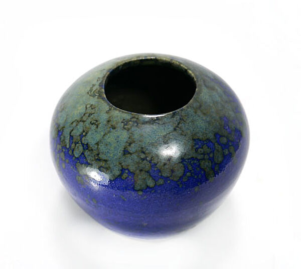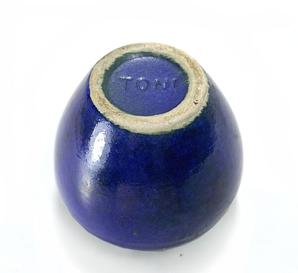Fast kugelförmig gebauchter, recht dünnwandiger Keramikkorpus aus hellem Scherben. Überwiegend tiefbaue, um den Rand inselförmig grünliche Glasur. Höhe ca. 7 cm, minimale Alters- bzw. Gebrauchsspuren. An der Bodenfläche geprägte Markung "TONI" (ungedeut), wohl Deutschland der 1910er, 20er Jahre.