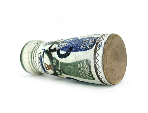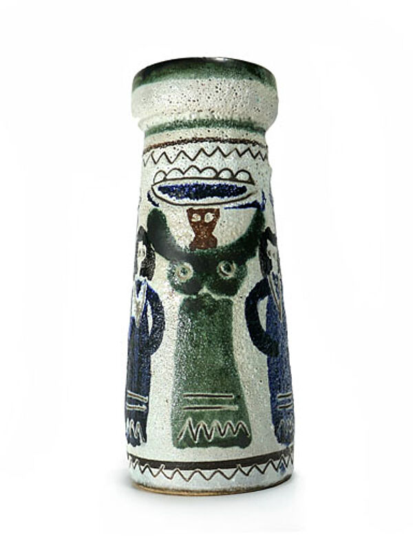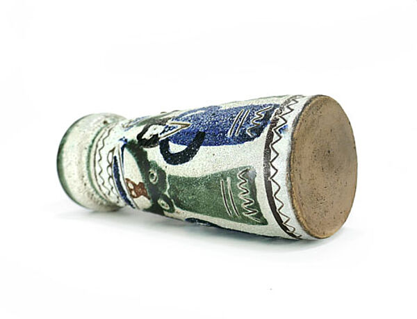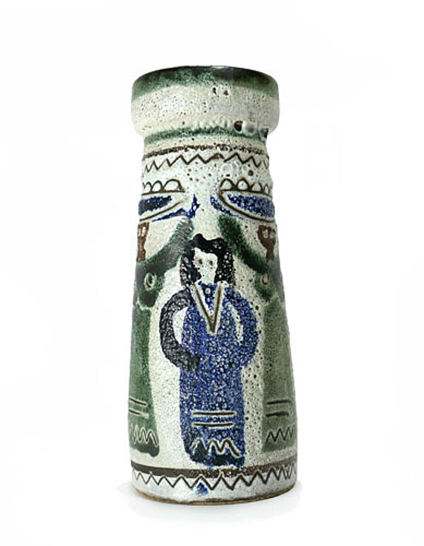 Annähernd zylindrischer, sich zum Hals leicht verjüngender, im Randbereich abgesetzt leicht verbreiteter Keramikkorpus aus hellem Scherben. Helle, fast weiße, Lava-artige Grundglasur mit handgemaltem, polychromen, naiv-expressiven, etwas volkloristisch anmutenden, aber auch etwas karikierenden figürlichen Dekor: es wechseln sich größere Frauen im grünen Kleid, die über ihren Kopf eine blaue Schale halten, mit etwas kleineren, schwarzharigen Frauen im blauen Kleid ab. Höhe ca. 13,5 cm, geringe Altersspuren. Ungemarkt, evtl. mediteraner Raum der 1960er, 70er Jahre.