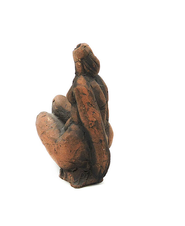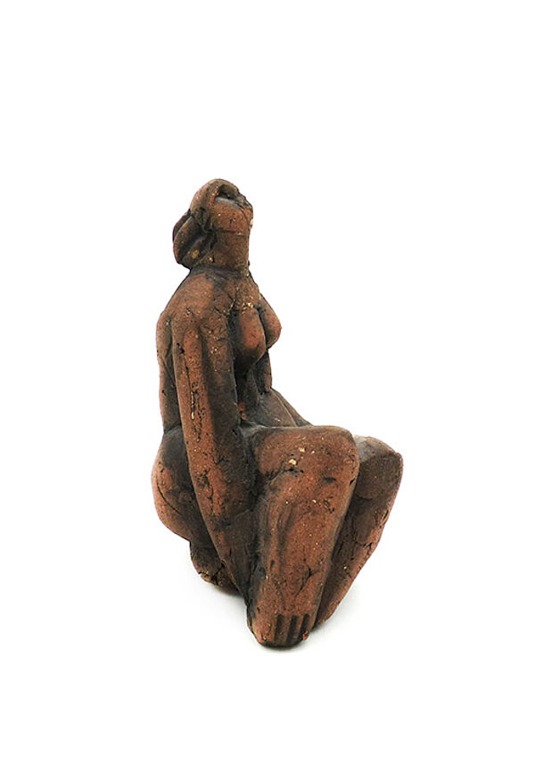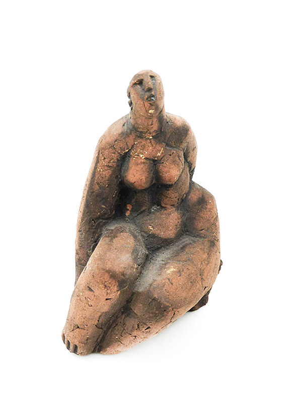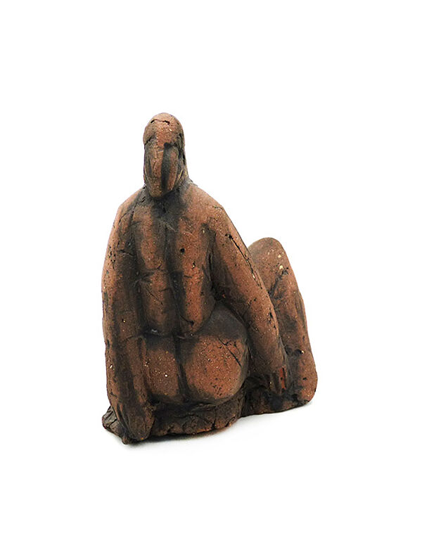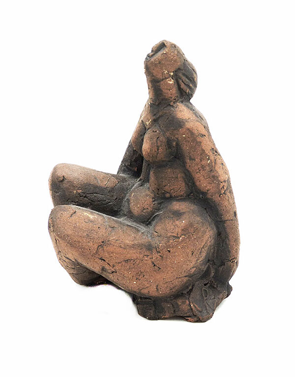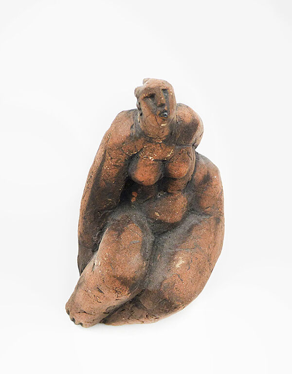 Wohl frei geformter Korpus aus rotbraunem Scherben, teilweise schwarz engobiert. Leicht stilisierte Darstellung eines sitzenden weiblichen Aktes. Maße ca. 10 x 4,5 cm, geringe Altersspuren. An der Plnthe monogrammiert: ligiertes "PW" oder "WP" (ungedeutet), vermutlich 1970er, 80er Jahre.