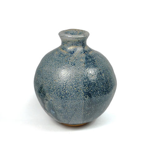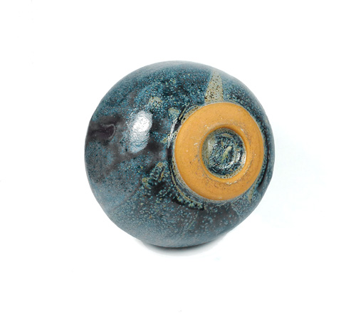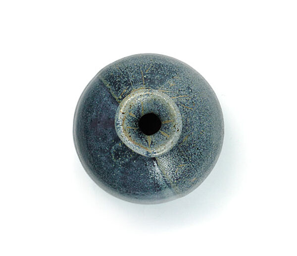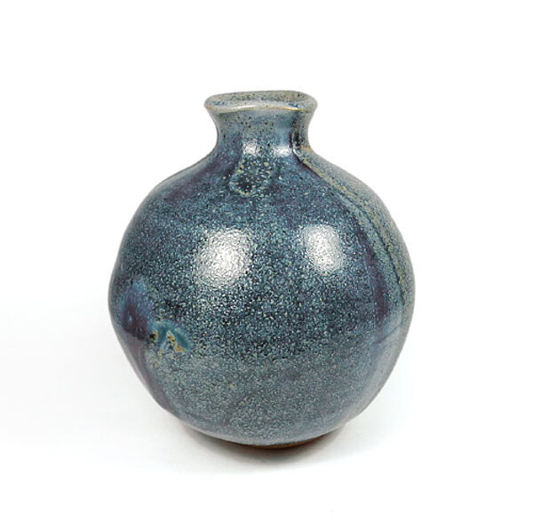 Kugelförmiger Keramikkorpus aus hellbraunem Scherben mit ausgestelltem, leicht tailliertem Hals. Expressive Laufglasur in hellen Blautönen. Höhe ca. 11 cm, geringe Gebrauchsspuren. Unterseitig ungedeutete Markung, wohl deutscher Keramiker der 1970er Jahre.