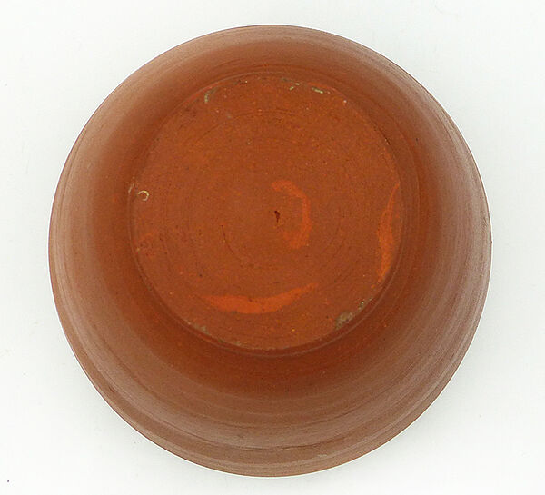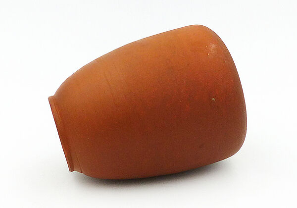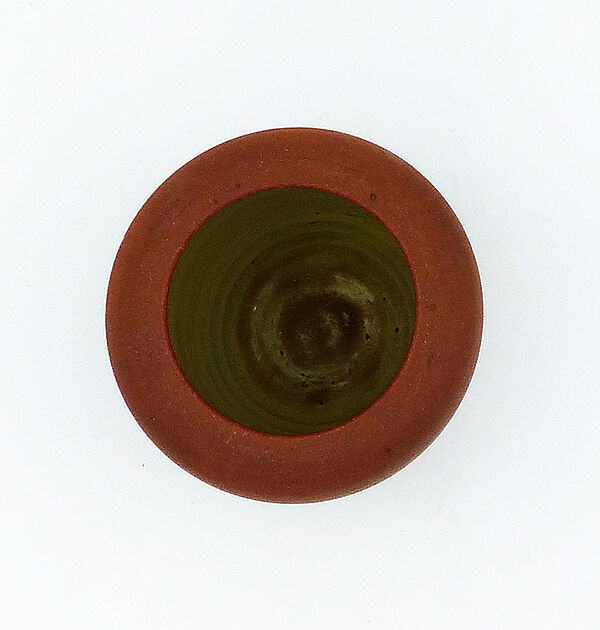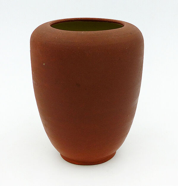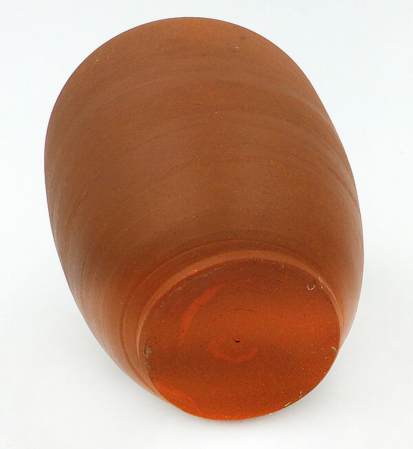Handgedrehter, sich zum Stand allmählich verjüngender Korpus aus rotbraunem Ton auf kleinem, flachen Stand und mit eingezogenem Randbereich. Rötlich-braun engobiert. Höhe ca. 12 cm, Durchmesser ca. 9 cm, geringe Alters- und Gebrauchsspuren. Ungemarkt, die Form und Art der Ausführung erinnert stark an Stücke von Walter Gebauer, der selbige auch nicht immer gemarktet hat. Wohl 1950er Jahre.