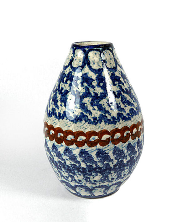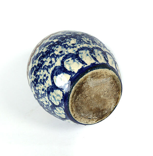Annähernd ovoider Keramik aus hellem Scherben, außenseitig polychrome Glasur mit abstraktem, z.T. geschwämmeltem, z.T. handbemaltem Dekor. Höhe ca. 11,5 cm, geringe Gebrauchsspuren. Ungemarkt, wohl Bunzlau der 1920er Jahre.