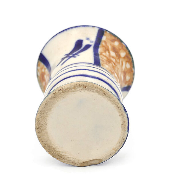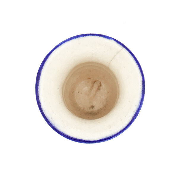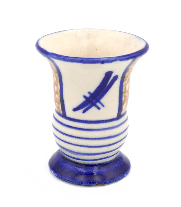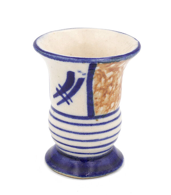 Gefußter, becherartiger Korpus mit leicht ausgestelltem Rand aus hellem Scherben. Hellbeige Grundglasur, außen abstraktes Dekor aus Flächen und Linien in Blau und Ocker, z.T. getupft, z.T. gemalt. Höhe ca. 6,5 cm, feiner, durchgehender Haarriss im oberen Korpusdrittel, Unterseitig flacher Chip. Ansonsten nur geringe Altersspuren. Ungemarktung, das Dekor verweist aber klar auf die Kunsttöpferei Neschwitz und stammt aus der Zeit zwischen 1910 und 1939, wo Reinhold Bartsch hier prägend tätig war. Quelle: bogelmusch.blogspot.com/p/blog-page_6.html 03/24