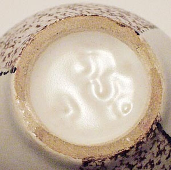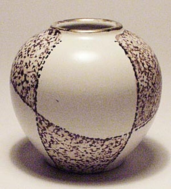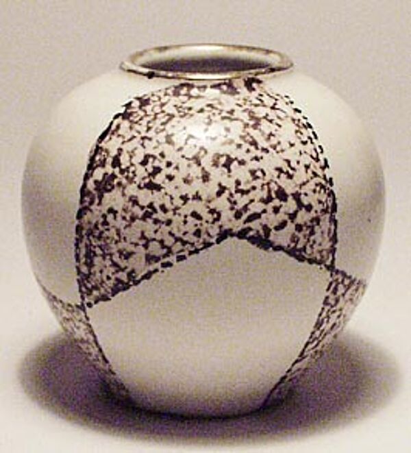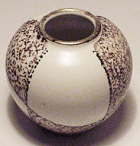 Gebauchter Korpus, heller Scherben mit netzartigem Dekor in weiß und braun bzw. schwarzen Linien. Kurz ausgestelle Mündung mit Goldrand. Höhe ca. 7 cm. Unterseitig von Glasur teilweise überdeckte Dekor-Nr. "360 / 7". Typisches Dekor von Ü-Keramik, wohl 50er Jahre.