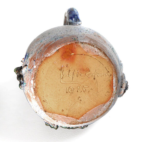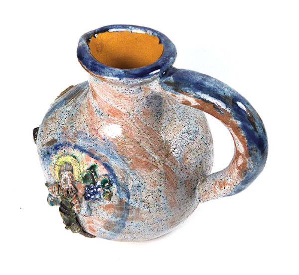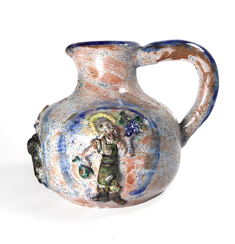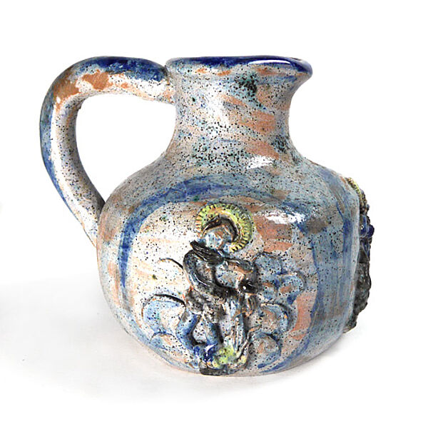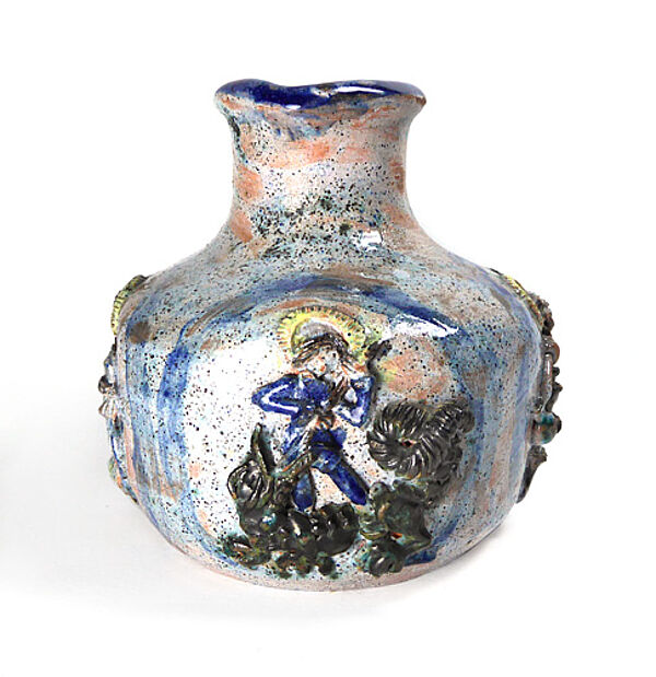 Gebauchter Korpus mit lang ausgezogenem Hals und annähernd C-förmiger Handgabe aus rötlichem Scherben, in Blau- und Rosé-Tönen glasiert. Schauseitig sind drei halbplastische Figuren angesetzt, jeweils einen Heiligen darstellend. So ist der heilige Georg im Kampf mit dem Drachen zu sehen, ein weiterer Heiliger mit Weintrauben in der Hand. Höhe ca. 10 cm, geringe Gebrauchsspuren. Unterseitig unleserlich signiert ("Elfie.....?) und datiert "1925".