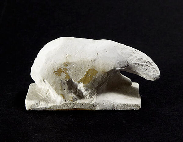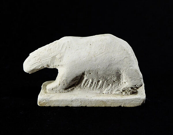 Per Hand geschnittener und modellierter, Gipskorpus - leicht abstrahierte Darstellung eines schreitenden Eisbären auf rechteckiger Plinthe. Länge ca. 4 cm, geringe Altersspuren. Wohl 1940er bis 60er Jahre.
