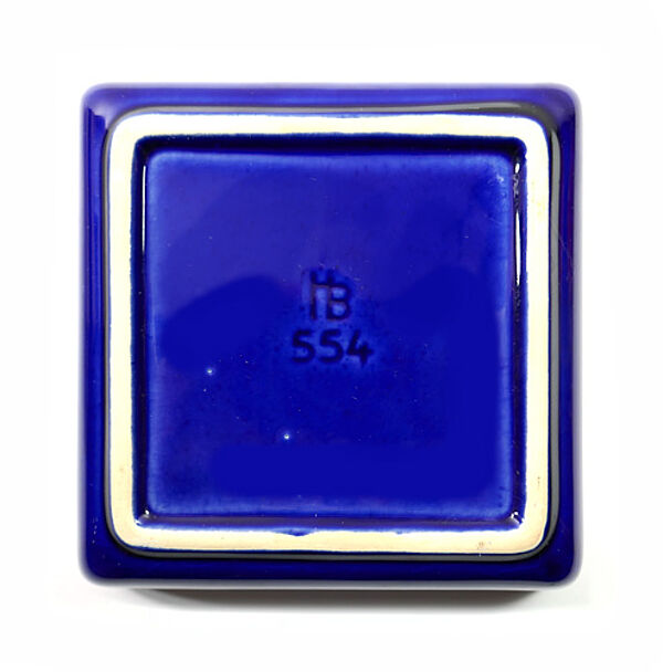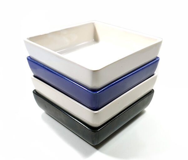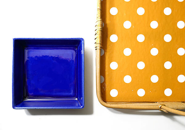 Quadratisches Korbtablett mit rechteckigem, z.T. umflochtenem Henkel, innen mit gelbem, weißgepunktetem Wachstuch bespannt. Von der Größe genau passend, gehören hier dazu vier quadratische Schälchen aus hellem Scherben mit fast rechtwinklig aufgestelltem Rand: zwei sind monochrom weiß, eines blau und eines schwarz glasiert. Maße der Schälchen ca. 12 x 12 cm, Maße Tablett ca. 26 x 26 cm Höhe Henkel ca. 13,5 cm, geringe Altersspuren. Die Schälchen weisen jeweils unterseitig eine in den Scherben gepresste Markung und Form-Nummer (554) auf. Wohl 1960er, 70er Jahre.