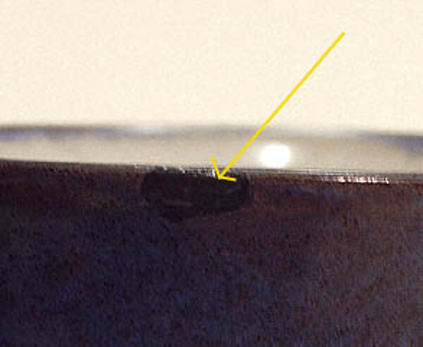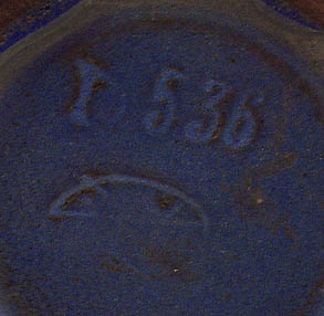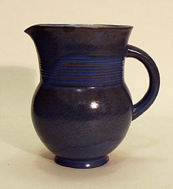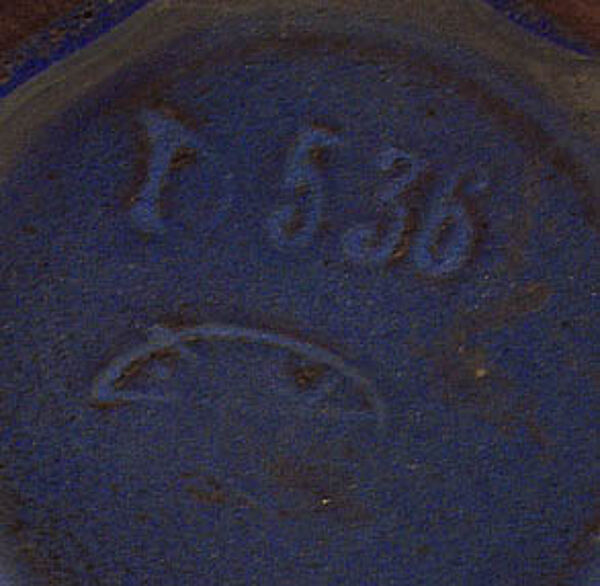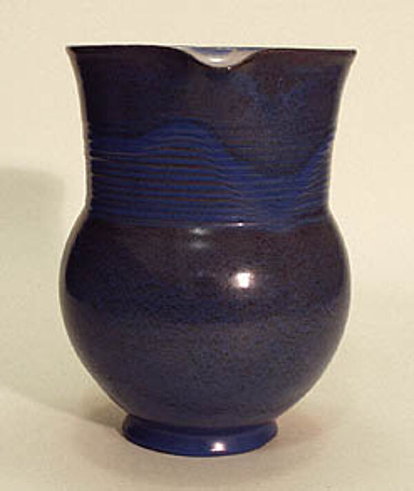 In der unteren Hälfte Flach gebauchter Korpus, in der oberen Hälfte Rillenfekor, flach ausgestellte Mündung. Klassische Handhabe. Dunkler Scherben, innen hellgraue und außen blaugraue Glasur, H. ca. 17 cm. An der oberen Außenkante farblich kaschierter Chip. Unterseitig gemarkt sowie Modellnr. (?) "D 536", wohl 30er Jahre.