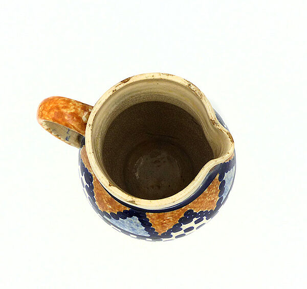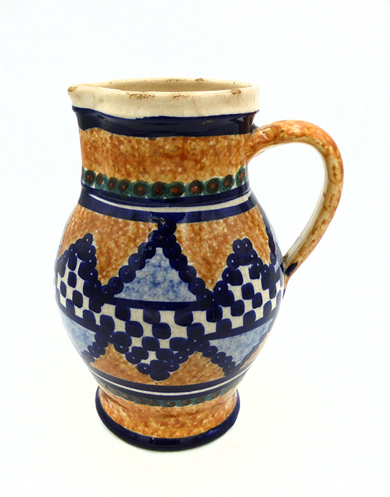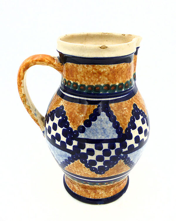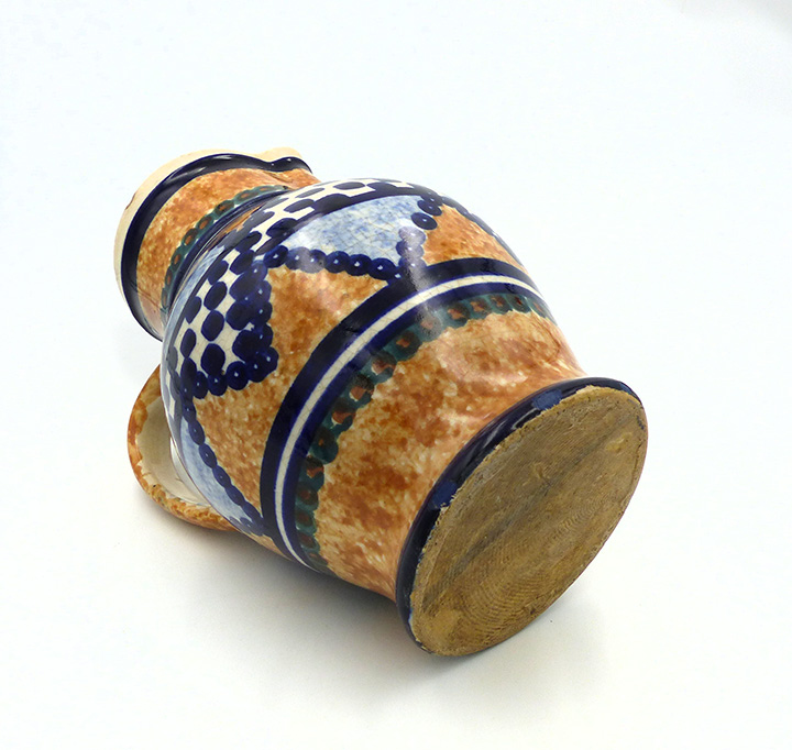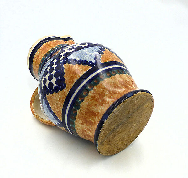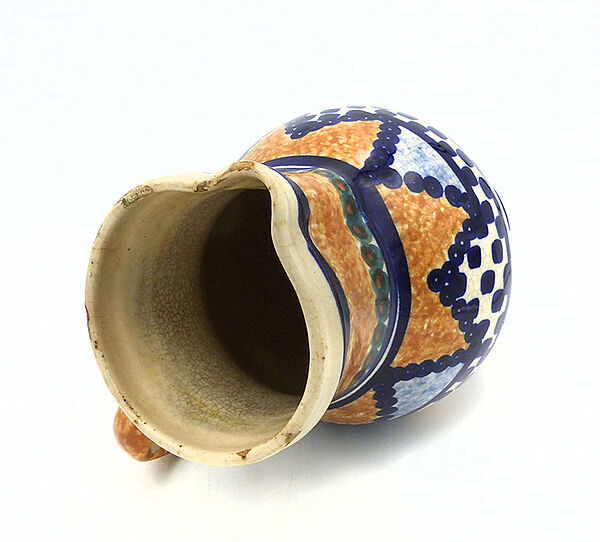 In der unteren Hälfte gebauchter, im Halsbereich leicht taillierter Korpus mit C-förmiger Handhabe und leicht ausgestelltem Mündungsrand mit Schnaupe aus hellem Scherben. Außenseitig handgemaltes abstraktes Dekor aus ockerfarbenen Feldern, unterteilt durch Linien und Bändern aus dreieckigen Elementen in Blautönen. Höhe ca. 21 cm, moderate Altersspuren, insbesondere zeigen sich kleinere Chips im Randbereich. Ungemarkt - entweder Kunsttöpferei Neschwitz oder Bunzlau der 1920er Jahre.