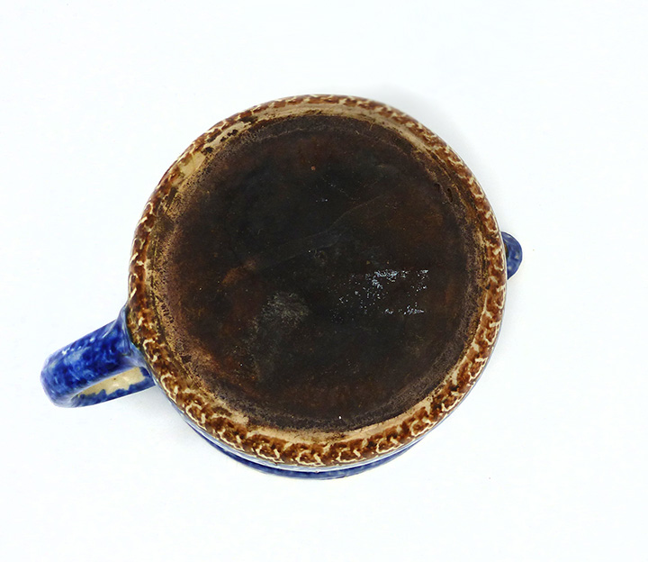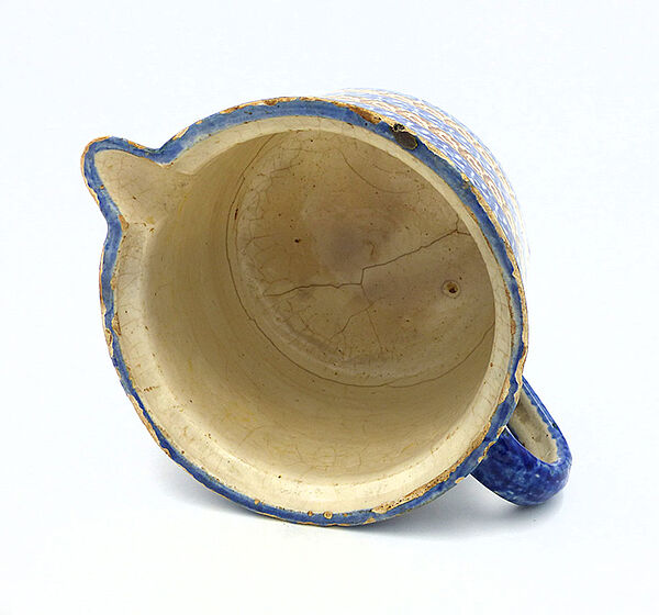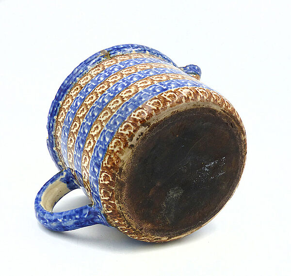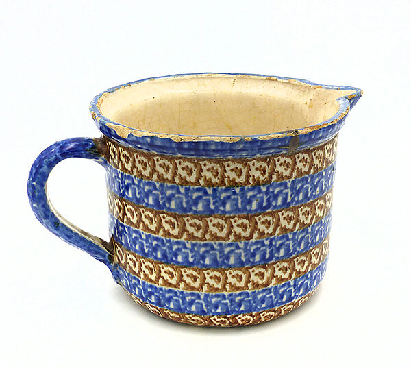 Zylindrischer Korpus mit C-förmiger Handhabe und leicht ausgestelltem Mündungsrand mit Schnaupe aus hellem Scherben. Außenseitig handgemaltes abstraktes Dekor aus geschwämmelten Bändern in Blau und Braun. Höhe ca. 12 cm, Durchmesser ca. 16 cm, moderate Altersspuren, so zeigen sich kleinere Chips am Rand und ein stärkeres Craquelée innenseitig am Boden. Wohl Bunzlau der 1910er Jahre.